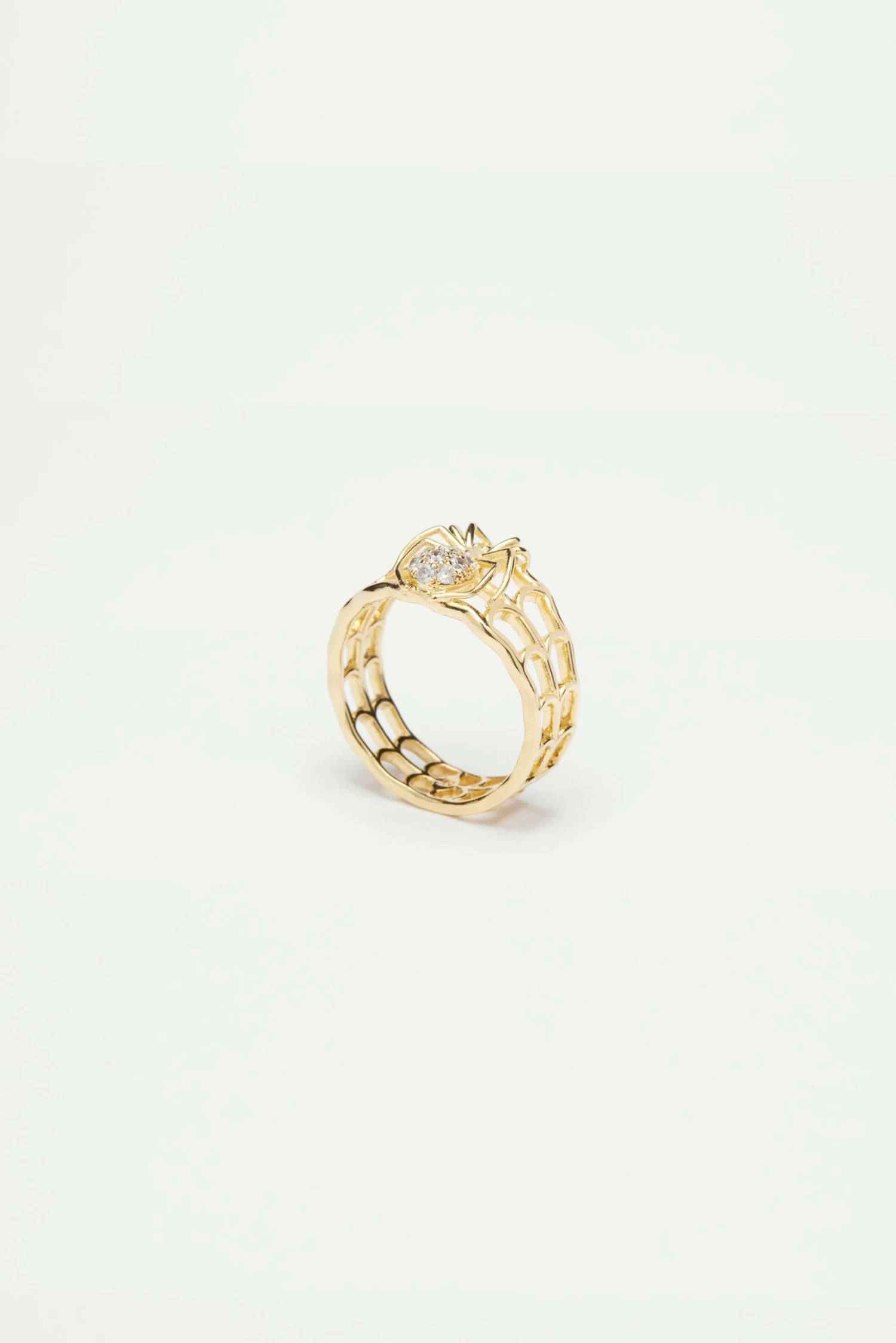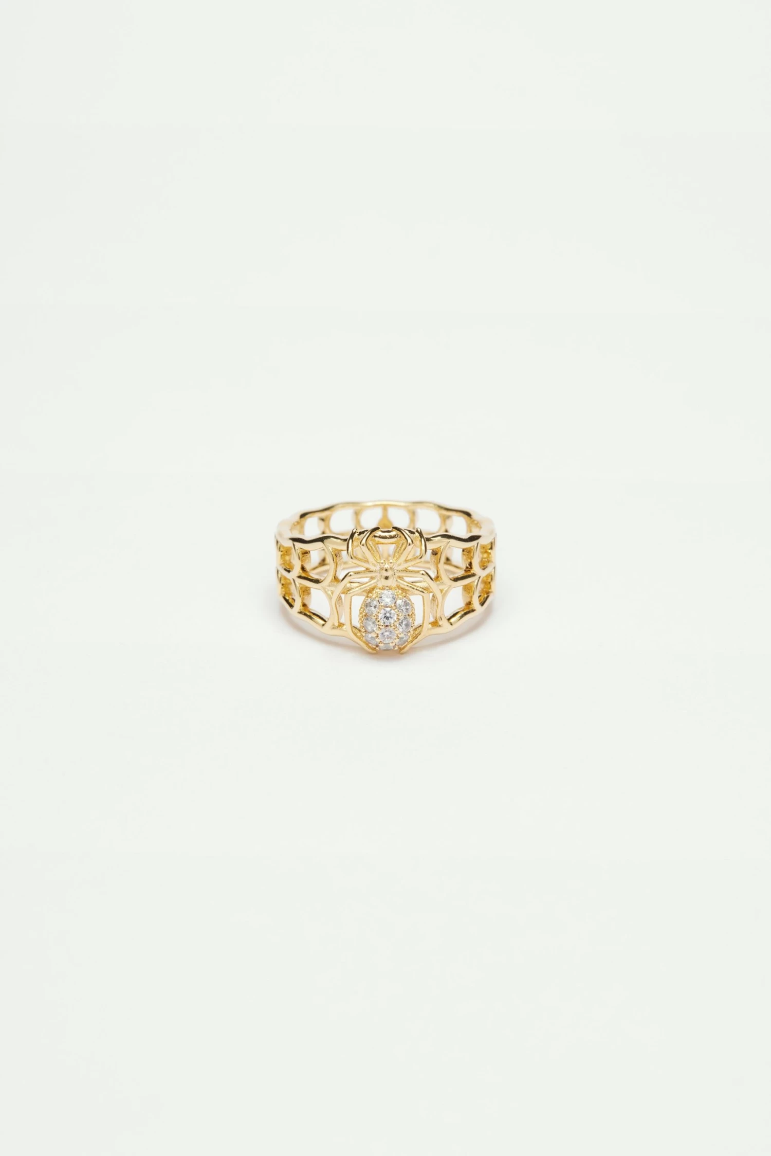 Bague large en laiton ajouré avec détails d’émail ocre sur les côté, araignée placée au milieu du bijoux ornée de cristaux, doré à l’or fin.