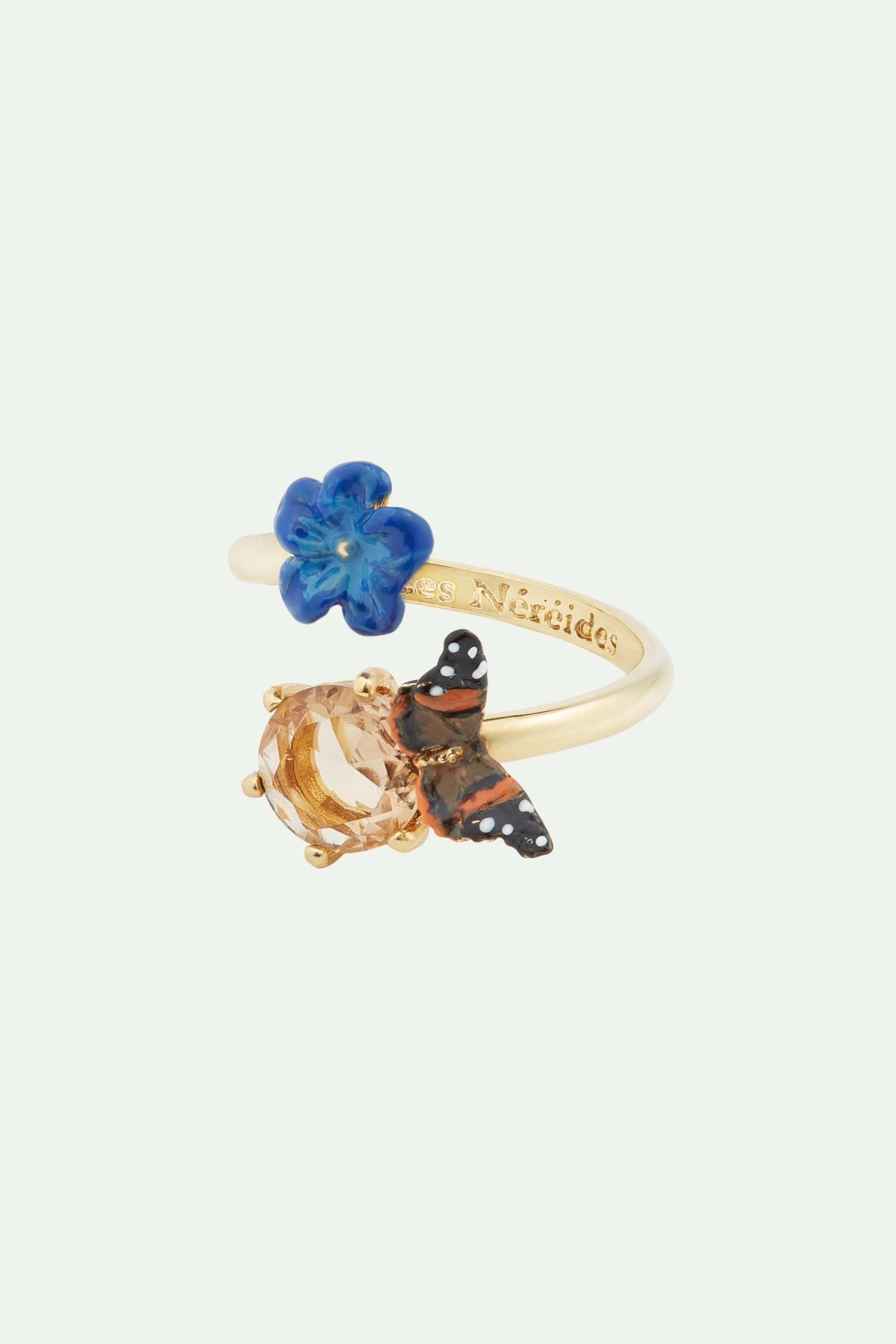La Maison Les Néréides propose une vaste sélection de bagues ajustables, dont cette bague ornée d’une fleur bleue d’un côté et d’une pierre ronde couleur champagne embellie d’un papillon monarque aux détails délicats, émaillés à la main. Vous pouvez porter cette bague à n’importe quel doigt en l’ajustant selon vos préférences, affichant ainsi un style bucolique et discret sur votre main. Pour compléter votre look, vous pouvez associer cette bague avec une paire de boucles d’oreilles tiges fleur de lin bleue, verre facetté et papillon. Bague Ajustable : Laiton doré à l’or fin émaillé à la main et verre facetté.