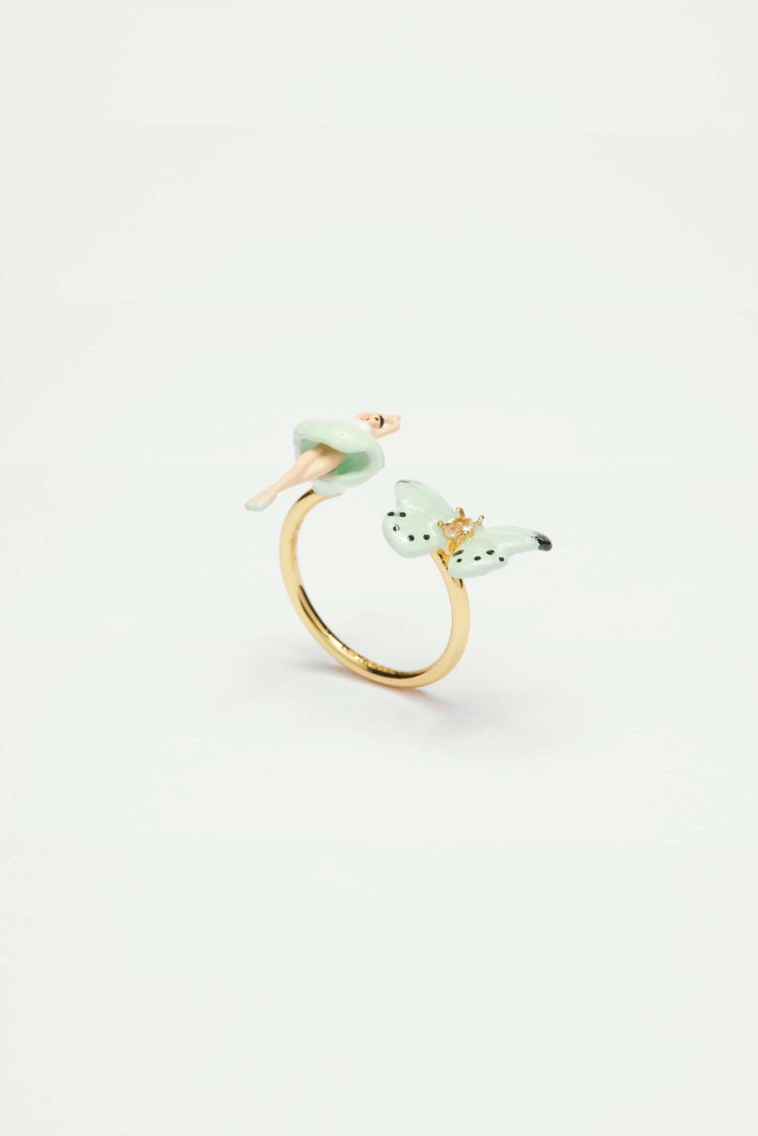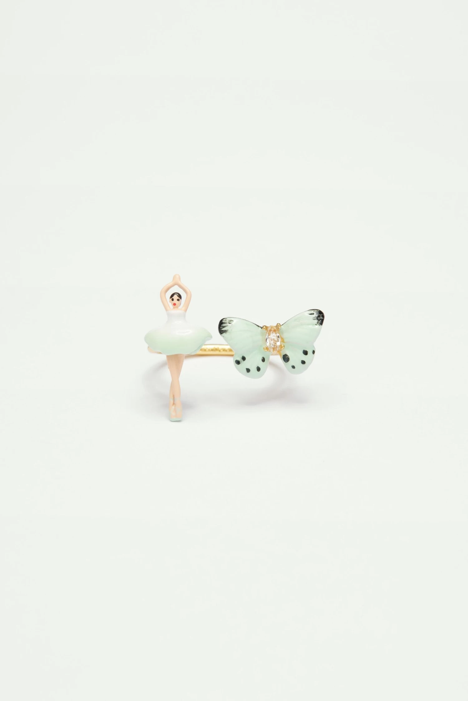 Cette bague ajustable met en scène une danseuse classique gracieuse sur pointes vert d’eau ainsi qu’un papillon émaillé à la main. Le papillon symbolise le renouveau et l’élégance, son corps est orné d’une pierre en verre taillé d’un blanc étincelant, ajoutant une touche d’éclat subtil au bijou. Elle s’associe parfaitement avec les boucles d’oreilles mini pas de deux et papillon vert d’eau.