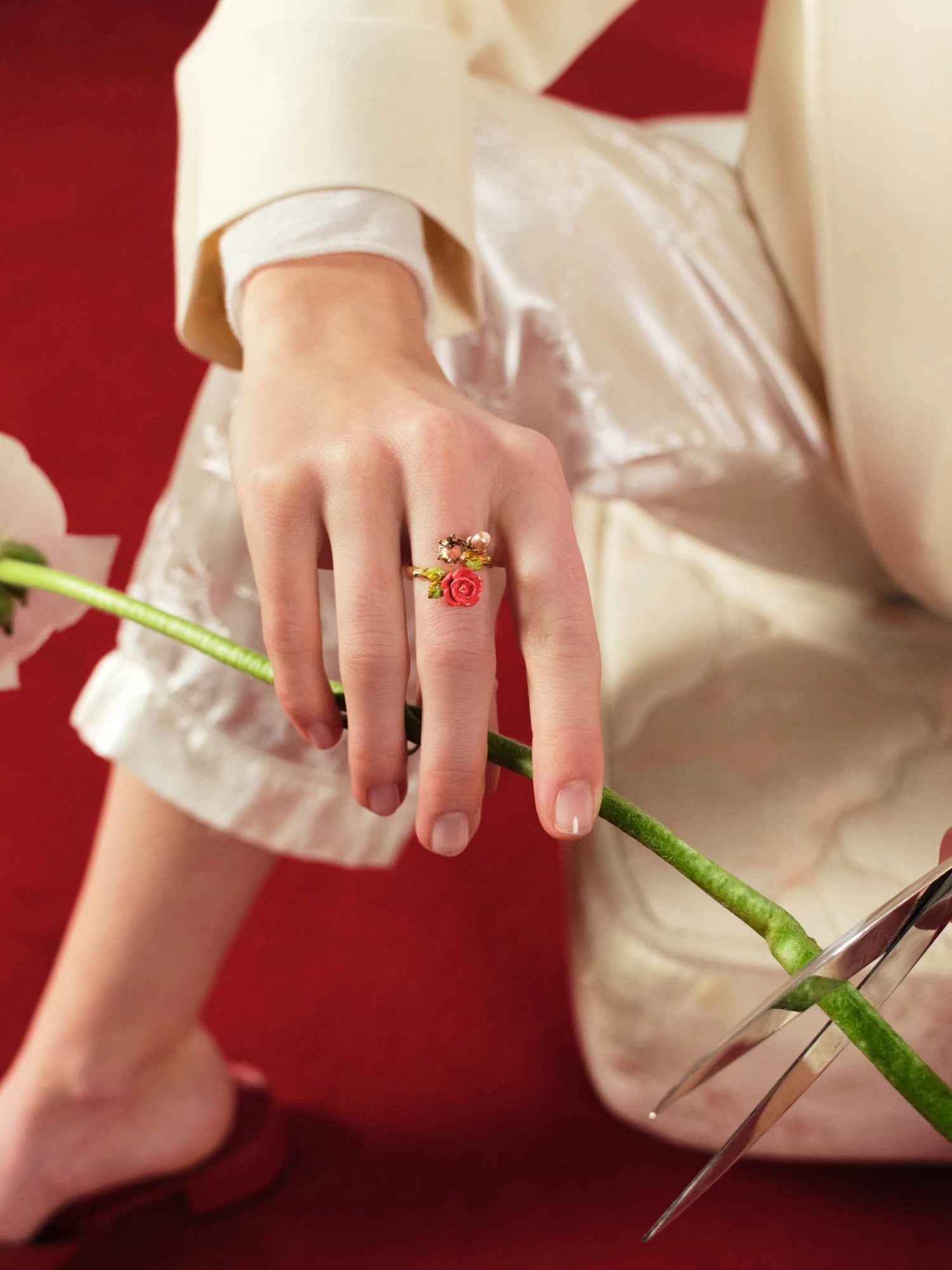 La Maison Les Néréides présente cette bague romantique et baroque issue de sa collection Antica Rosa. Avec une apparence rappelant celle d’une rose, cette bague enserre votre doigt avec une rose épanouie d’un côté et de l’autre côté, une pierre de verre facettée de couleur bronze ainsi qu’une perle de culture. Cette bague ajustable est le cadeau parfait, qui peut être assorti avec un autre bijou fantaisie de la même collection pour un effet encore plus saisissant. Bague Ajustable : Laiton doré à l’or fin, émaillé à la main, perle de culture, verre facetté.
