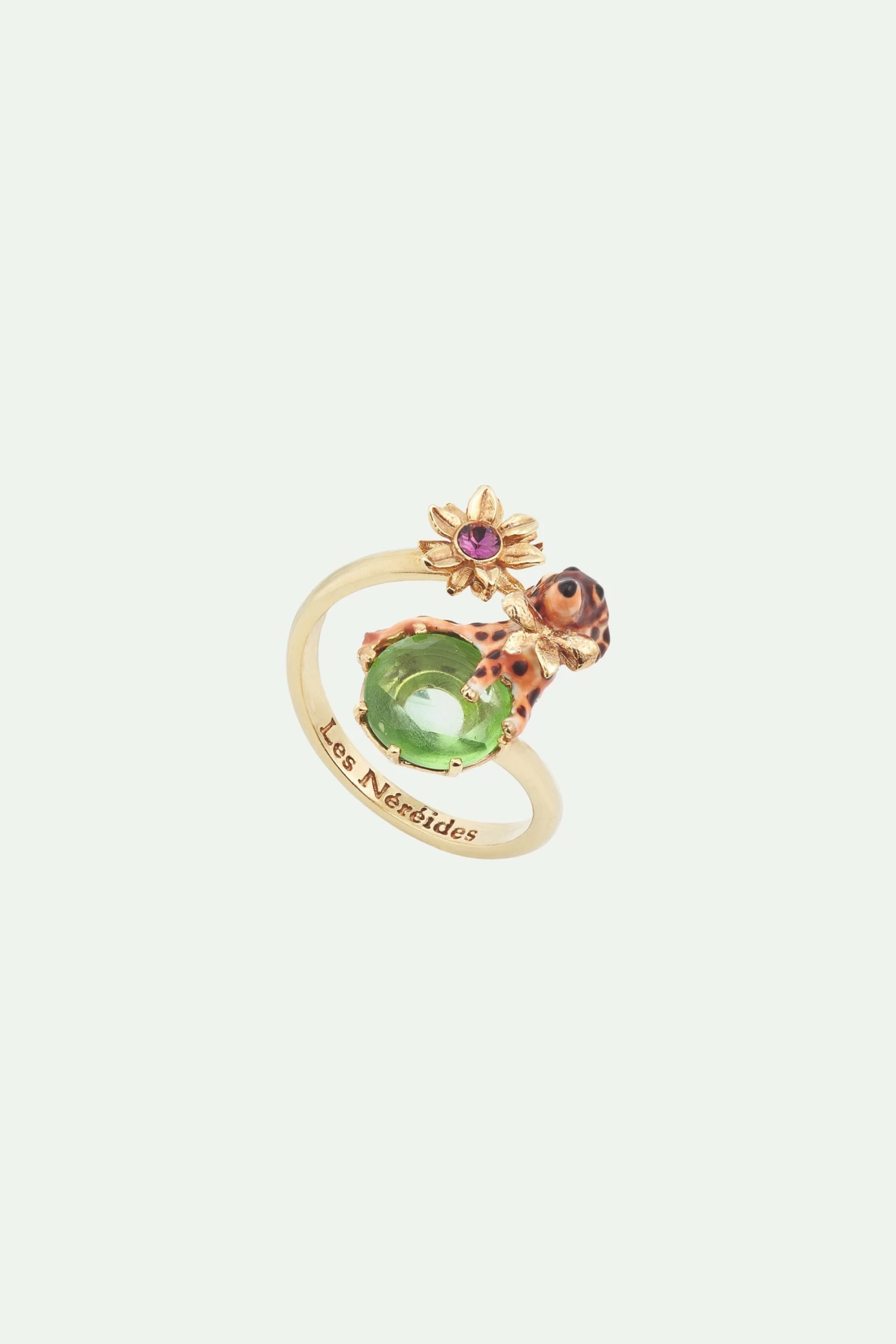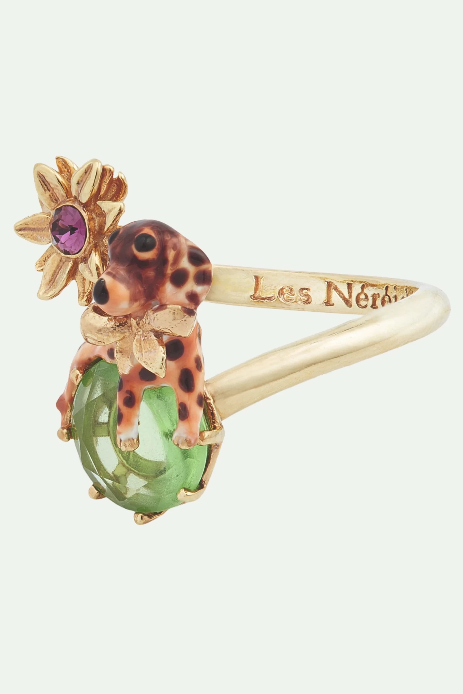 Arborez la bague ajustable teckel et pierre à votre doigt pour y faire rayonner votre amour pour ces compagnons à quatre pattes. Pour cette nouvelle collection Les Néréides Loves Animals, le teckel est l’animal de choix pour incarner l’attachement de La Maison à la cause animale. Sur cette bague ajustable, un teckel au pelage brun ponctué de taches noires se repose sur une pierre verte et se montre sous un jour coquet. Le bijou se distingue également par sa pierre ronde verte qui apporte une touche de couleur, et une fleur dorée avec un cœur de cristal. Pour compléter votre look vous pouvez former une parure avec cette bague et le collier pendentif teckel et pierre. Bague Ajustable : Laiton doré à l’or fin, émaillé à la main, cristal et verre facettés.