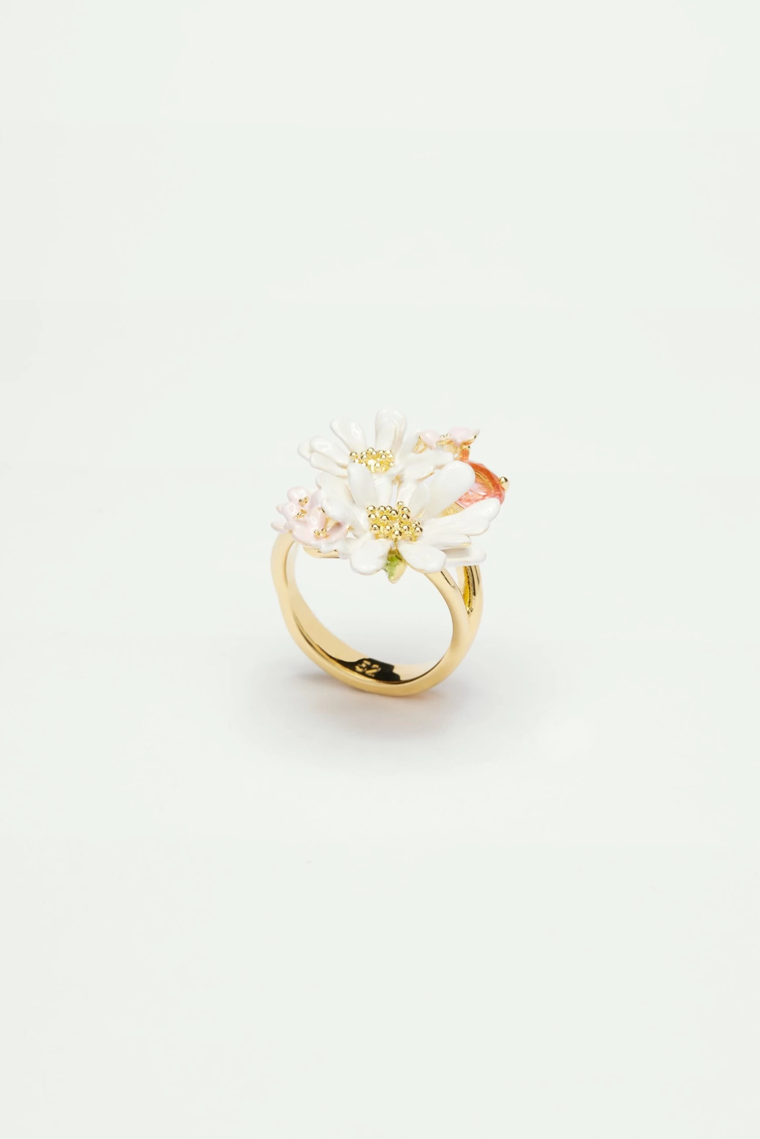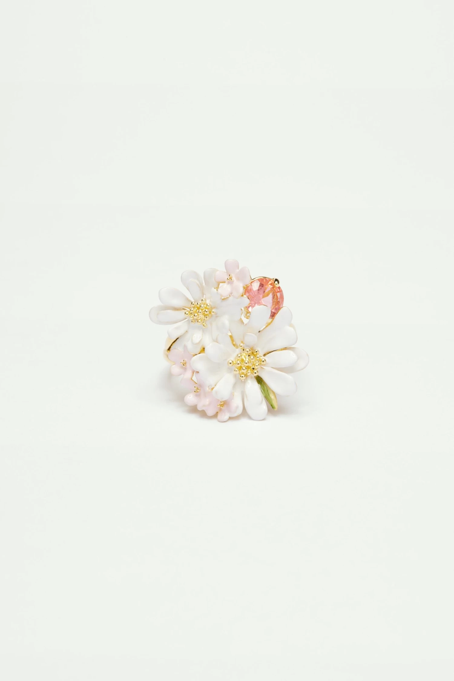 Sublimez votre style avec cette bague cocktail mettant en scène un bouquet de fleurs, une fusion parfaite de la nature et d’élégance à votre doigt. Son design original propose une pierre rose en verre taillé entourée de fleurs de verveine et de fleurs d’Orlaya évoquant la fraîcheur d’un jardin printanier. Ce bijou raffiné est idéal pour les femmes qui apprécient les bagues imposantes avec du caractère. Bague Cocktail : laiton doré à l’or fin, émaillé à la main et verre taillé.