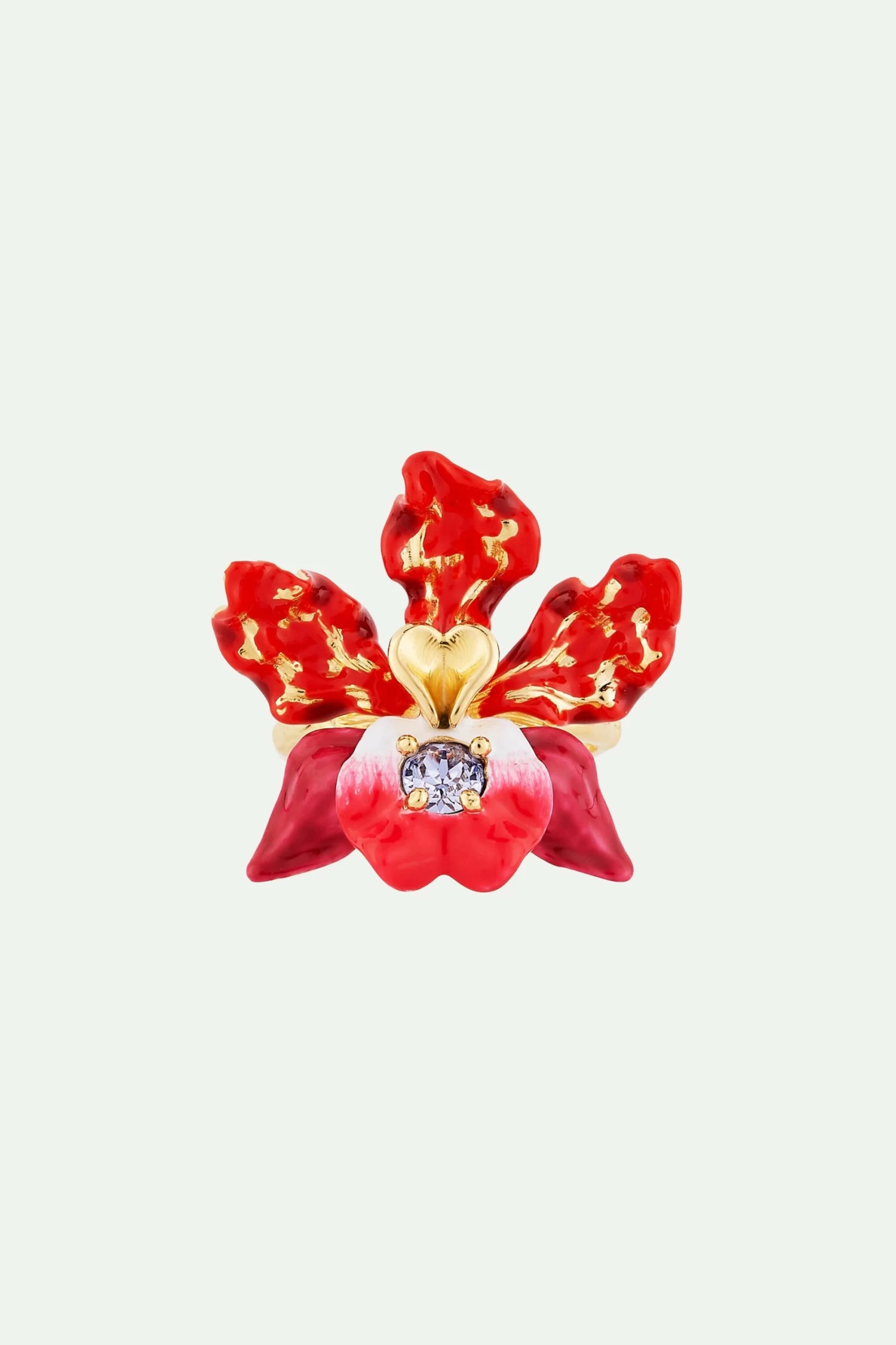 Bague cocktail, fleur orchidée rouge et or en émail, cristal taillé au cœur de ses pétales.