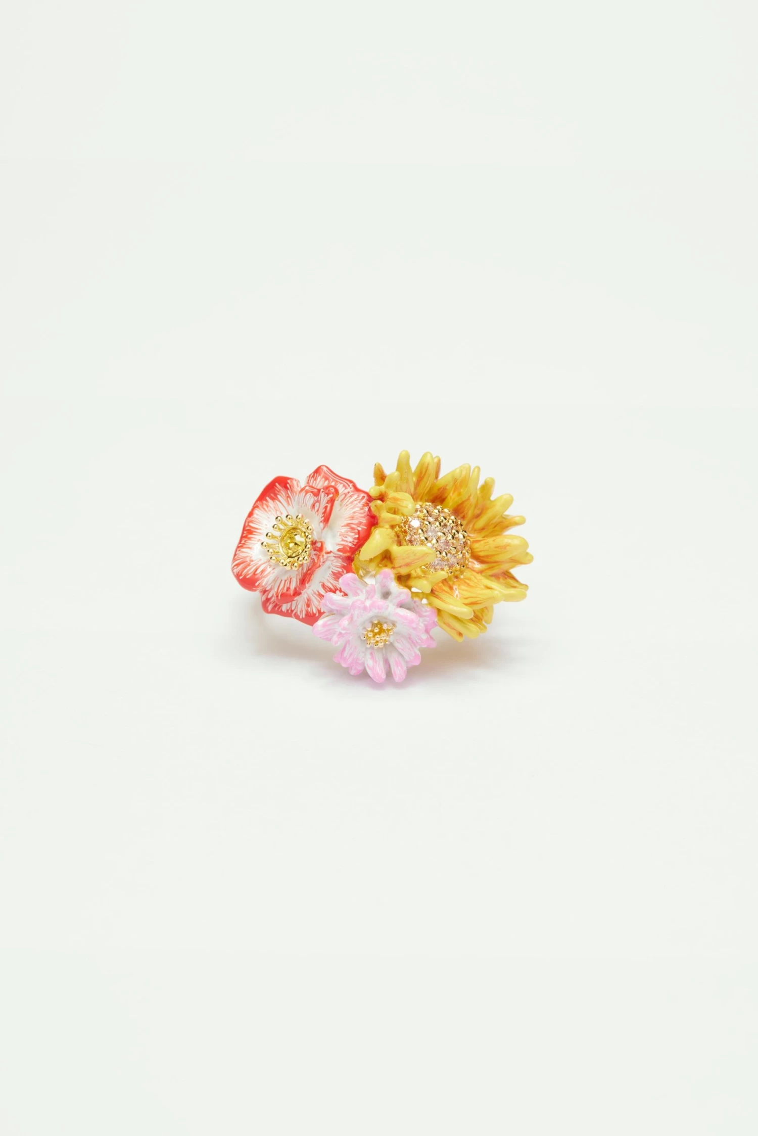 Sur votre doigt, une symphonie florale s’épanouit avec cette bague cocktail où le tournesol, le coquelicot et la marguerite dansent en harmonie tissant une mélodie enchanteresse à la splendeur des champs. Trois fleurs, dont chacune est un trésor en soi prennent vie sur votre doigt. Le tournesol déploie ses pétales chauds, le coquelicot flamboie avec passion, et la marguerite évoque la douceur de l’innocence. Cette bague est parfaite pour ajouter une touche de fraîcheur et de nature à votre tenue.