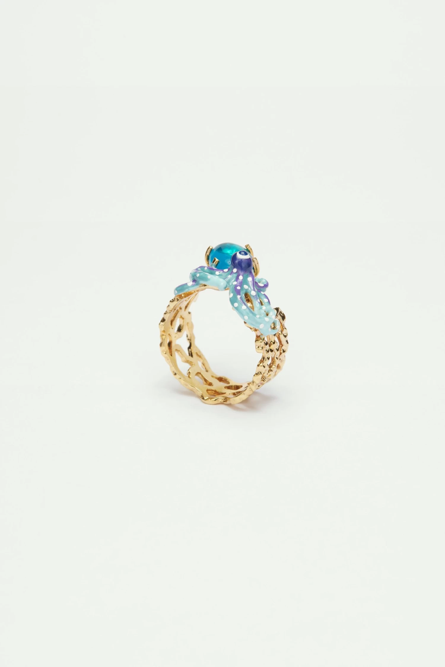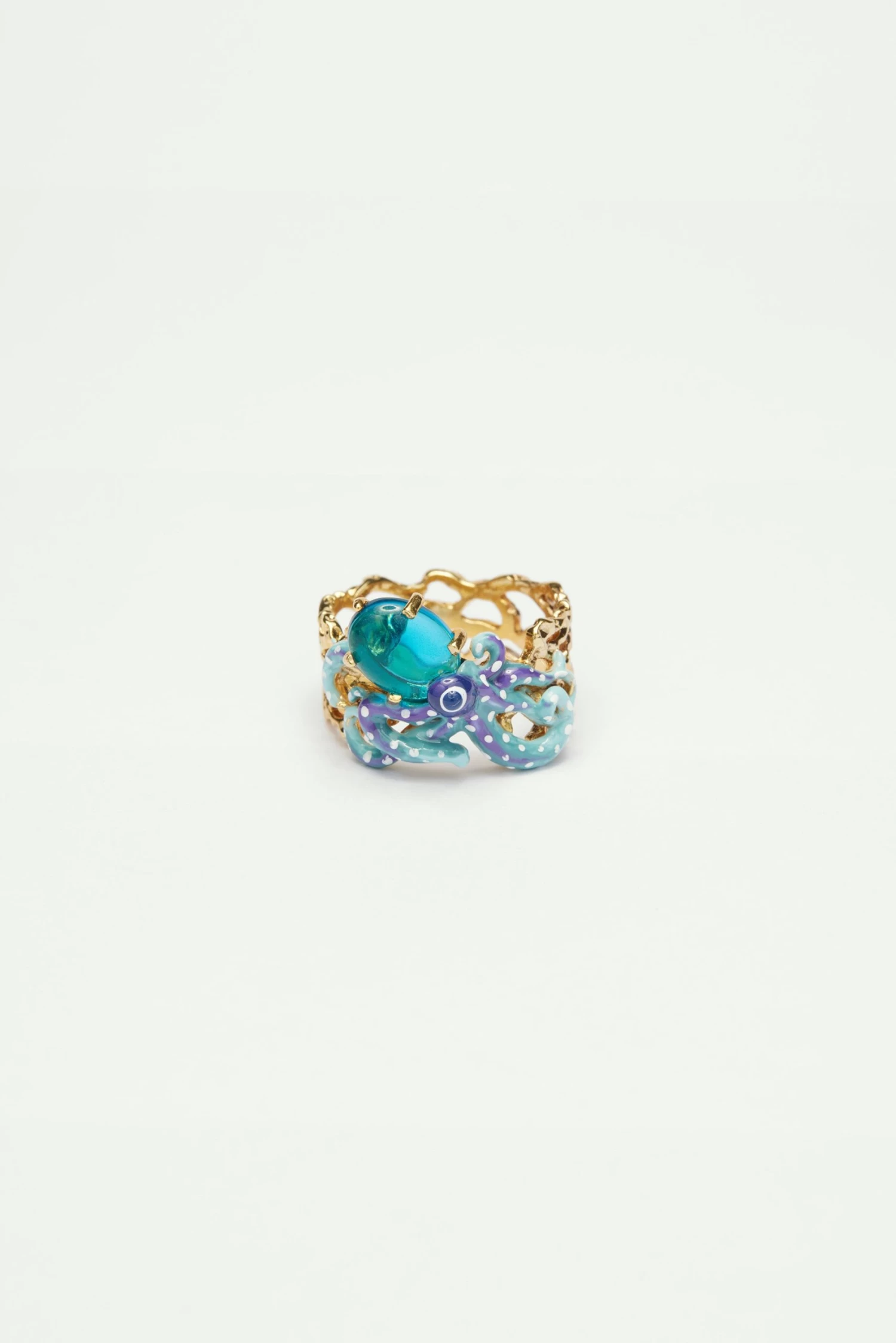 Au centre de cette bague, une pieuvre émaillée à la main, sa tête constituée d’une pierre en verre taillé bleu scintille tel un joyau des profondeurs. Ses tentacules, minutieusement travaillés s’étendent avec grâce autour de votre doigt.