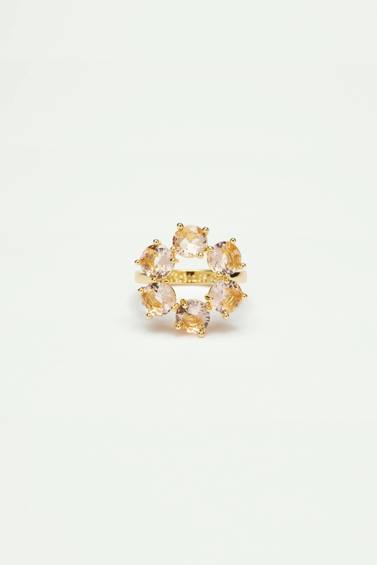 Bague fine, 6 pierres rondes en verre facetté dans les tons abricot montées en cercle, monture en laiton doré à l’or fin.