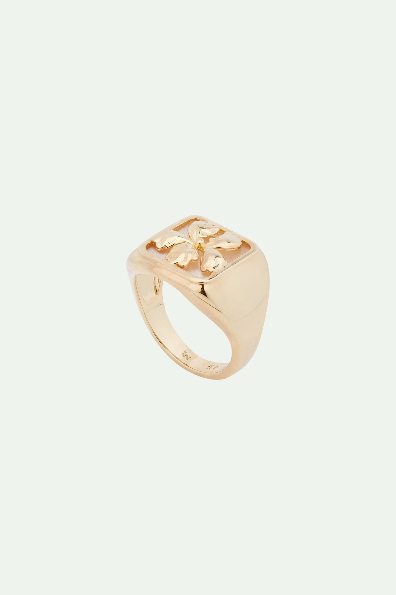 Délicatement déposée sur une chevalière et une plaque de nacre, la fleur d’iris, avec ses pétales dorés à l’or fin, décore cette bague de sa magnificence. Succombez à la collection Nature Flamboyante composée de parures célébrant l’iris sous de nombreuses formes.