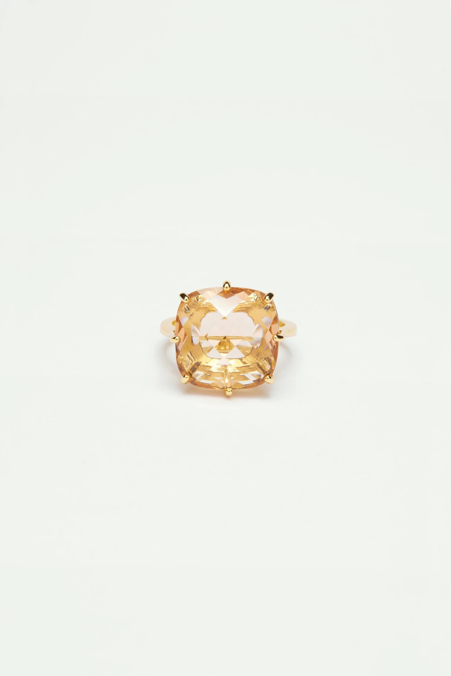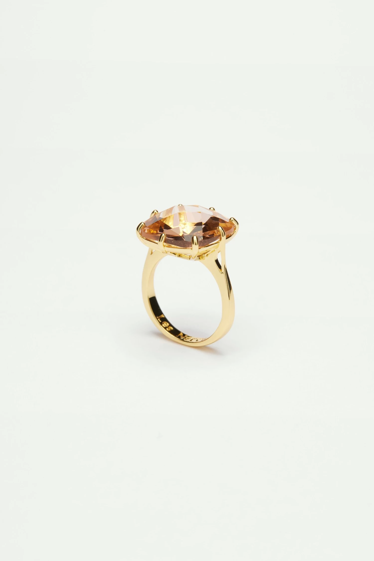 Bague solitaire, pierre carrée en verre facetté dans les tons abricot, monture en laiton doré à l’or fin.