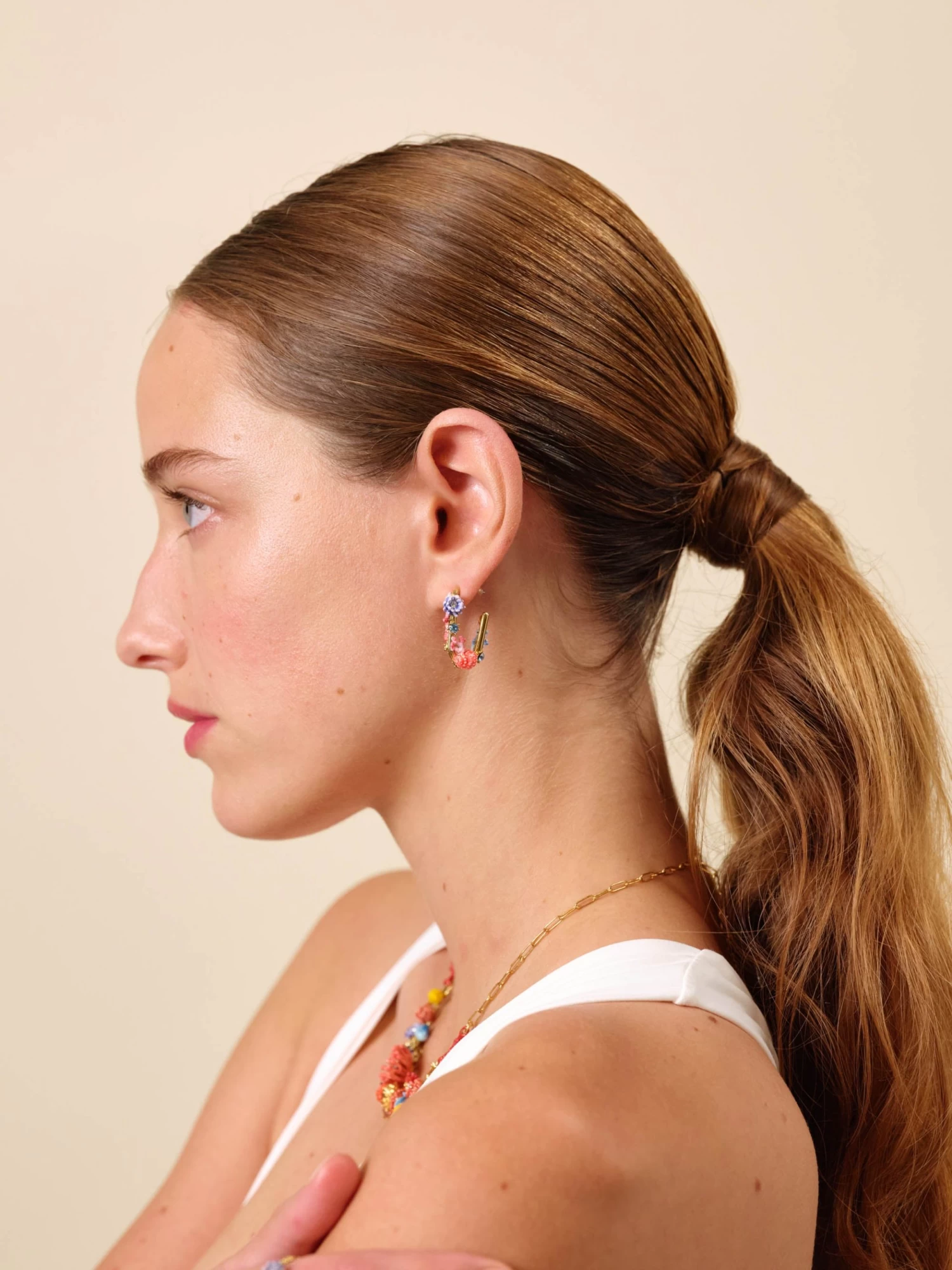 Ces boucles d’oreilles mettent en valeur les profondeurs marines. Ce bijou est un véritable trésor des abysses mettant en scène une symphonie d’éléments marins précieux. Un coquillage, témoin des récifs lointains partage sa lueur rosée évoquant la sérénité paisible des eaux cristallines. Les coraux roses et bleus expriment la vivacité et l’élégance des récifs sous-marins. En haut du bijou se trouve un oursin, ajoutant une touche d’authenticité à cette création marine. Pour une parure complète et harmonieuse, associez ces boucles d’oreilles avec le bracelet fin coquillage, coraux et pierre en verre taillé de la même collection.