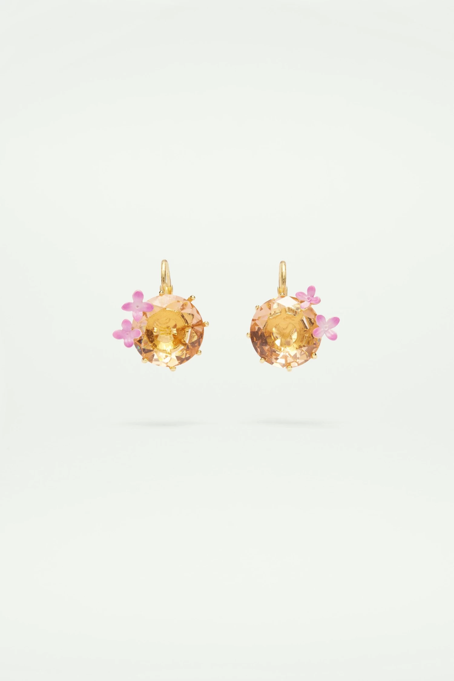Boucles d’oreilles dormeuses, pierre ronde en verre facetté dans les tons abricot, détails de fleurs de lilas roses en émail, monture en laiton doré à l’or fin.