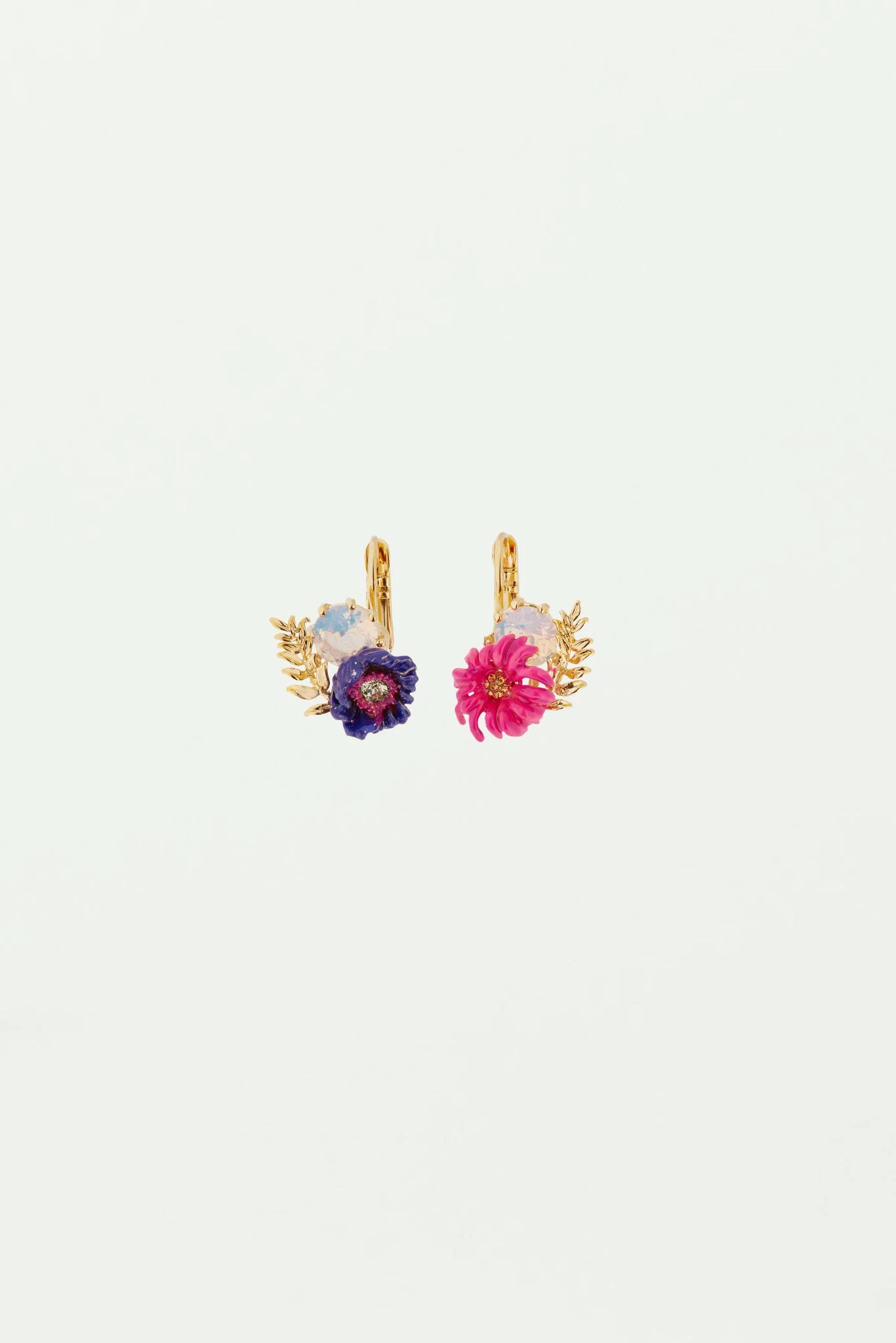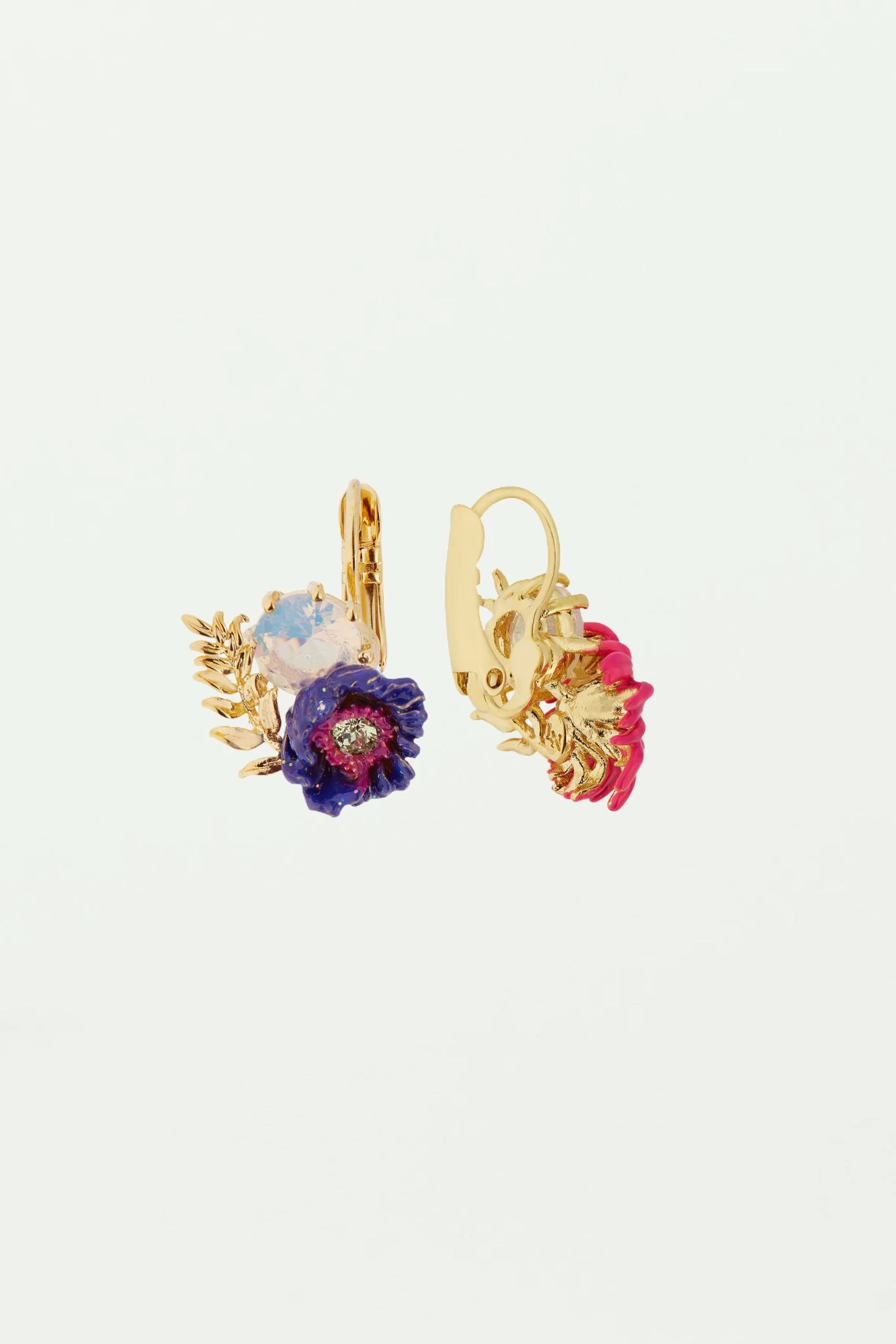Boucles d’oreilles dormeuses asymétriques, fleurs imaginaires dans les tons roses et bleus émaillées à la main, parées d’un cristal rond.