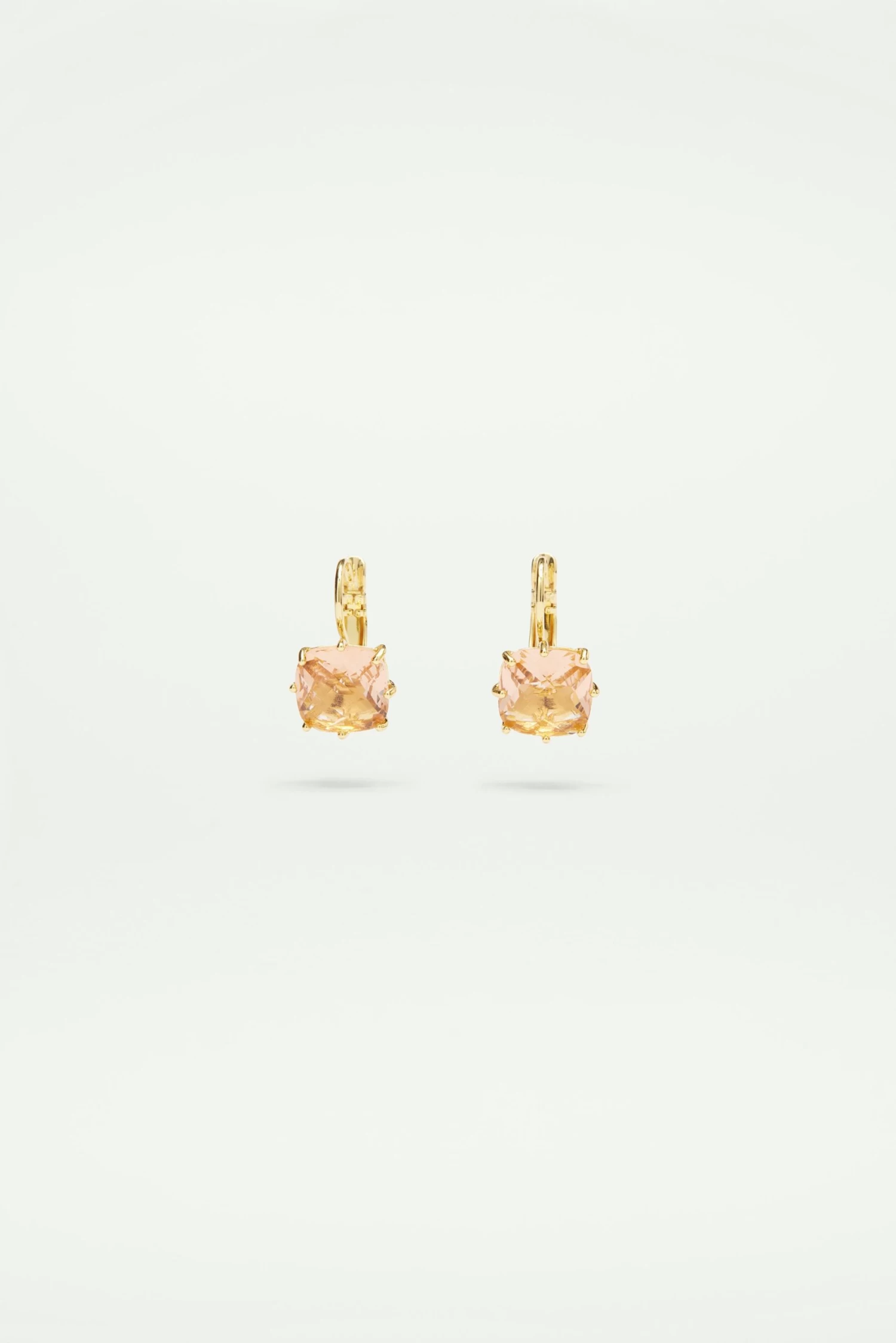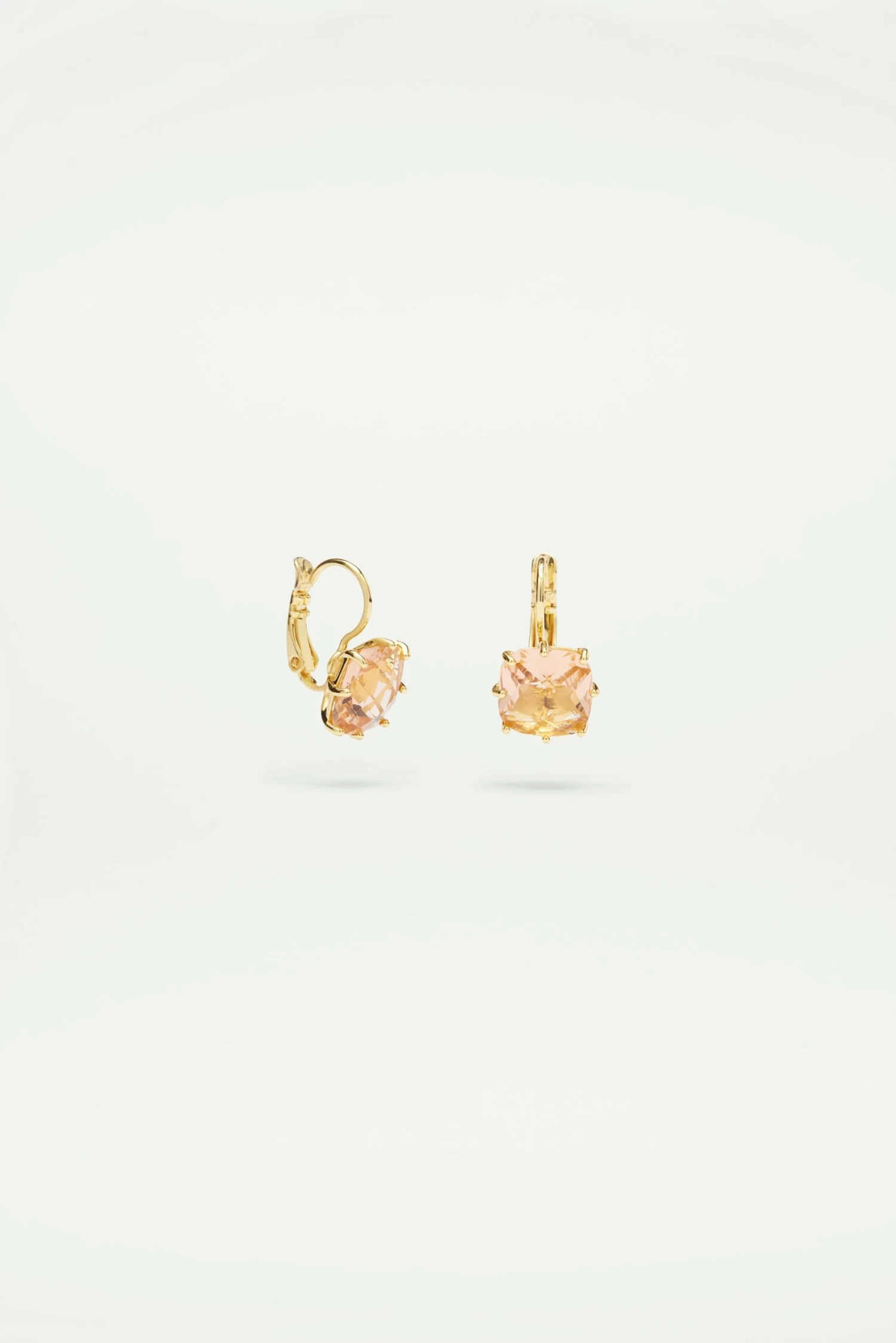 Boucles d’oreilles dormeuses, pierre carrée en verre facetté dans les tons abricot, monture en laiton doré à l’or fin.
