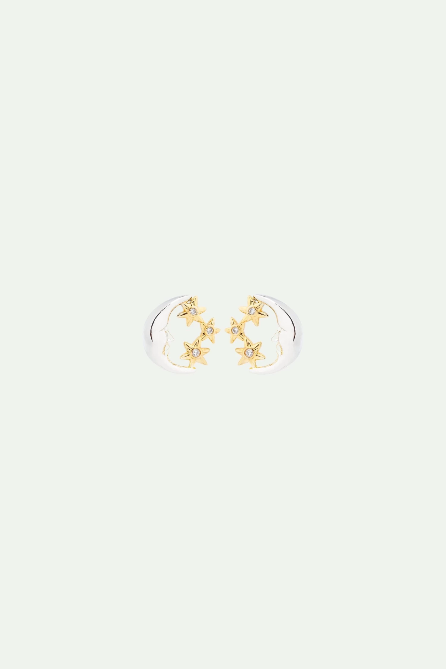 Entrez dans l’univers magique de La Maison Les Néréides et découvrez les boucles d’oreilles lune et étoiles. Cette paire de boucles d’oreilles fantaisie associe avec subtilité les teintes chaudes de l’or et de l’argenté pour créer un équilibre parfait. Les croissants de lune en placage platine argenté dépeignent un visage souriant qui évoque la douceur et la bienveillance. Quant aux trois étoiles dorées, elles ajoutent une touche de glamour et de féérie. Ces boucles d’oreilles offrent une certaine polyvalence des tenues, pouvant être assorties à d’autres bijoux dorés ou argentés, vous permettant ainsi de personnaliser votre look selon votre humeur et votre style. Boucles d’Oreilles : Laiton doré à l’or fin, placage platine et oxydes de zirconium.