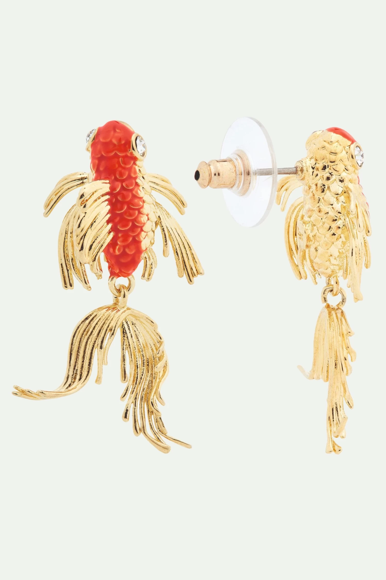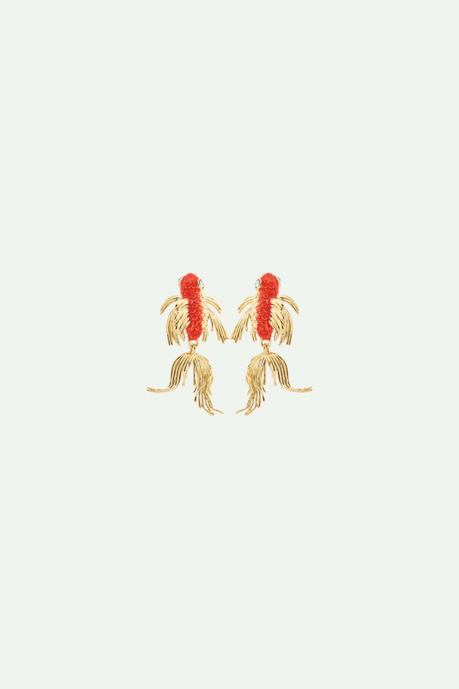 Vous êtes invités au pays du Soleil-Levant pour découvrir cette paire originale de boucles d’oreilles tiges carpes koï. Présentes dans la collection Onde Sereine, ces boucles d’oreilles représentent une carpe koï ondulante au corps de couleur orange et nageoires dorées. Ce bijou inédit Les Néréides sera un cadeau très apprécié des amateurs de bijoux originaux et de ceux qui s’intéressent à l’esthétique japonaise. Pour un total look japonisant, optez pour l’accessoire mode broche carpe koï à positionner sur un sac ou un chapeau. Boucles d’Oreilles Tiges : Laiton doré à l’or fin, émaillé à la main.