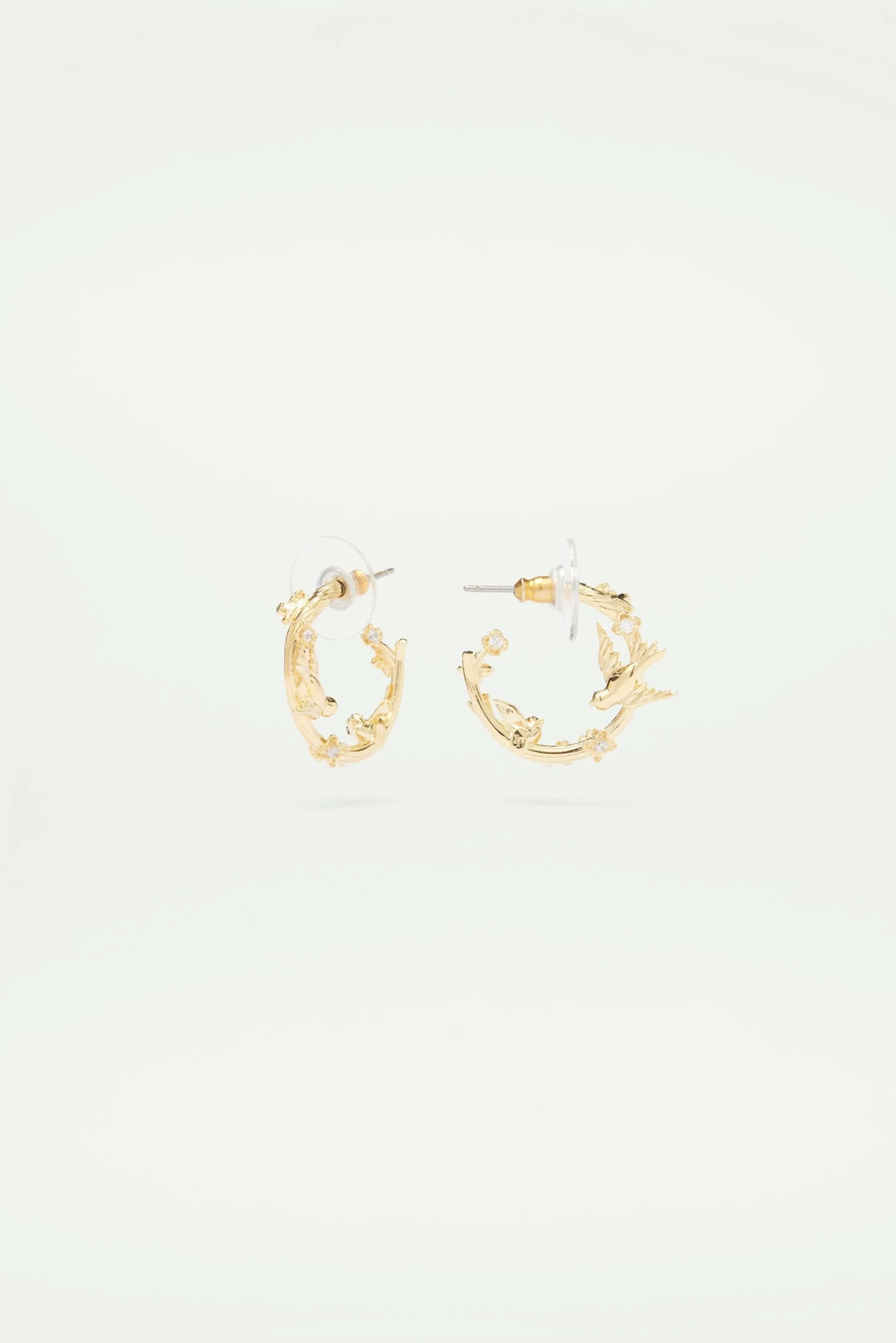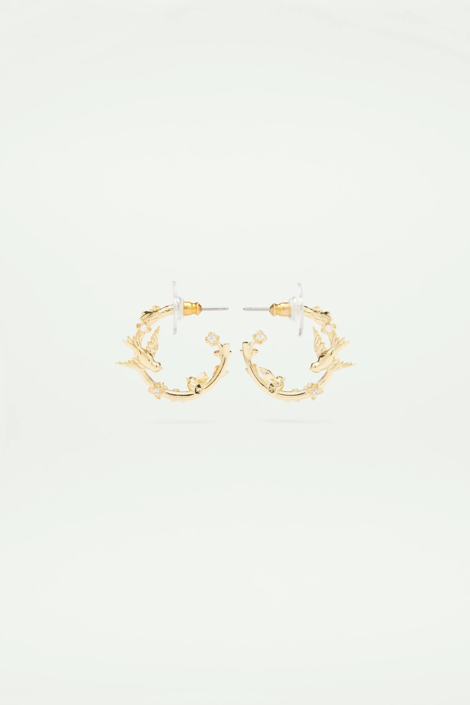 Boucles d’oreilles créoles, laiton doré à l’or fin, inspiration végétale, deux hirondelles dorées, petites fleurs ornées de cristaux.