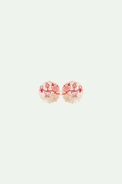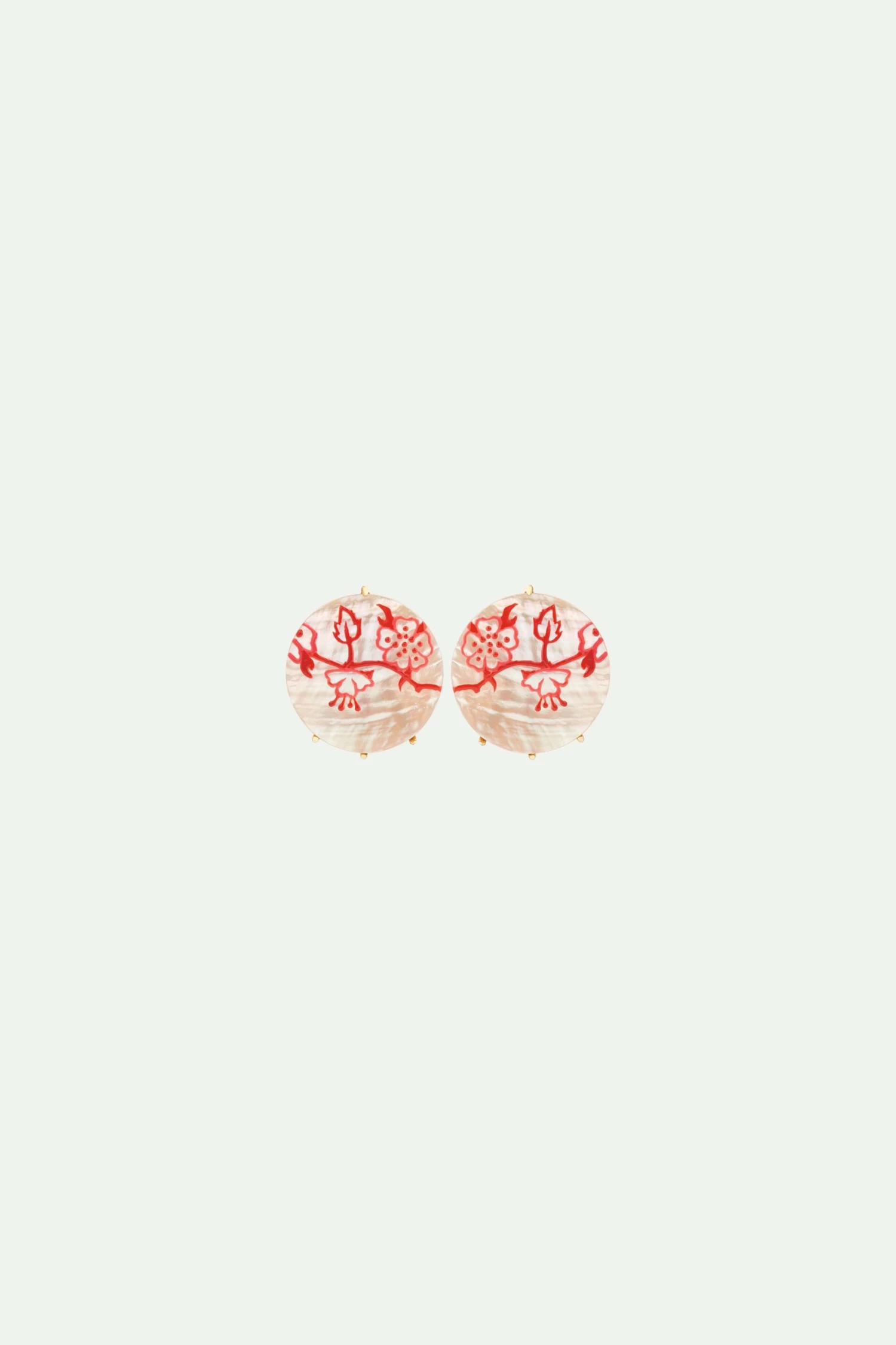 Utilisée pour sa belle apparence et sa luminosité, la nacre est mise à l’honneur dans la collection Estampe Nacrée qui propose cette paire de boucles d’oreilles tiges estampe rouge de rosier sur nacre. Une estampe au motif floral de couleur rouge est peinte sur la pièce de forme ronde pour créer un contraste avec la nacre blanche. Ces boucles d’oreilles originales peuvent être assorties à d’autres bijoux en nacre pour créer un ensemble coordonné. Boucles d’Oreilles Tiges : Laiton doré à l’or fin, estampe nacrée, émaillée à la main.