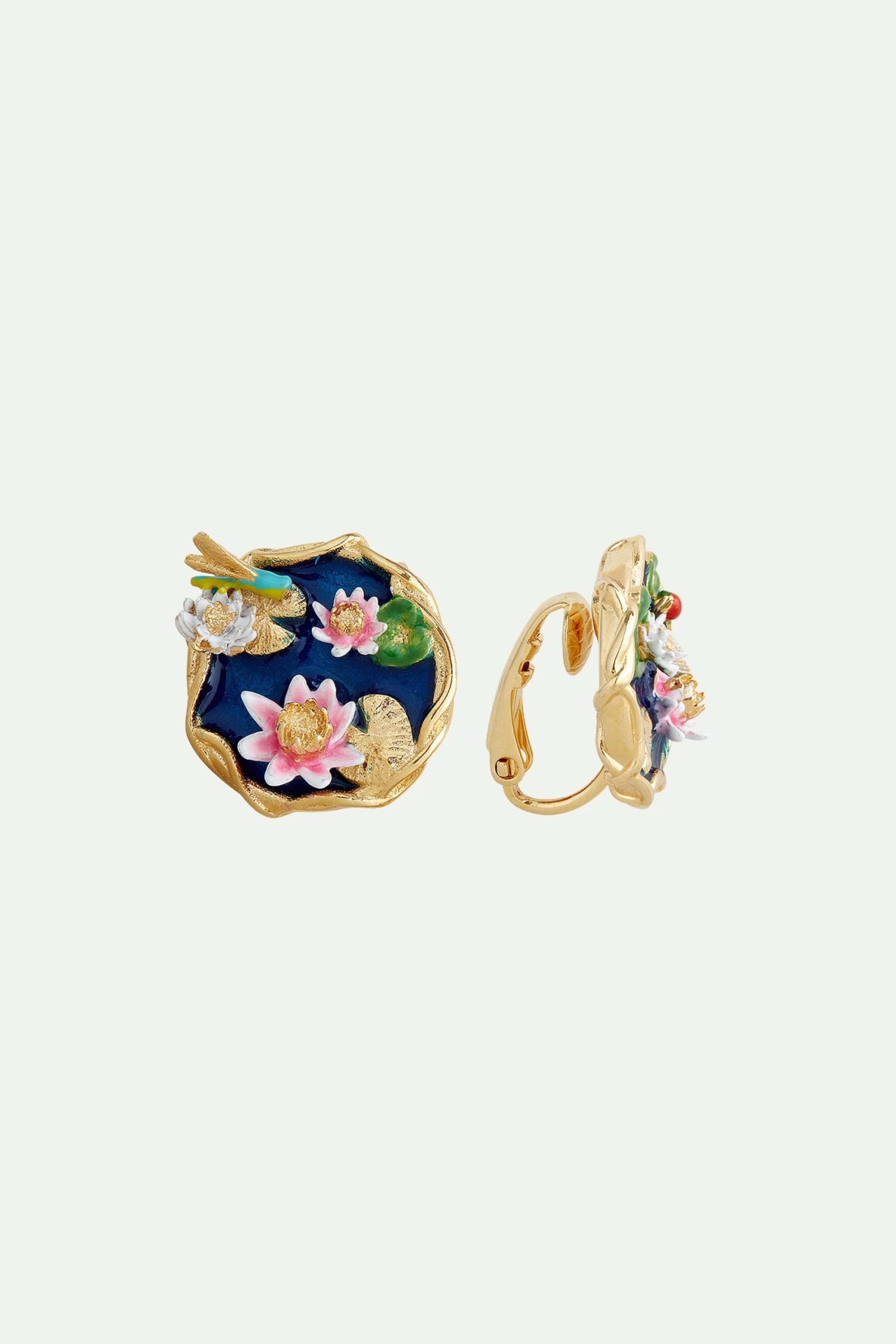 La collection Jardin Flottant inspirée des peintures de Claude Monnet, Les Nymphéas des bijoux haute fantaisie qui vous plonge dans les merveilleux jardins de Giverny. Ces boucles d’oreilles tiges sont émaillées à la main et offrent une scène inédite au-dessus d’un petit étang. Ce paysage inédit est composé de petits nymphéas reposant sur des nénuphars et d’une libellule turquoise qui apporte de la légèreté à ce bijou original. Boucles d’Oreilles Tiges : Laiton doré à l’or fin et émaillé à la main