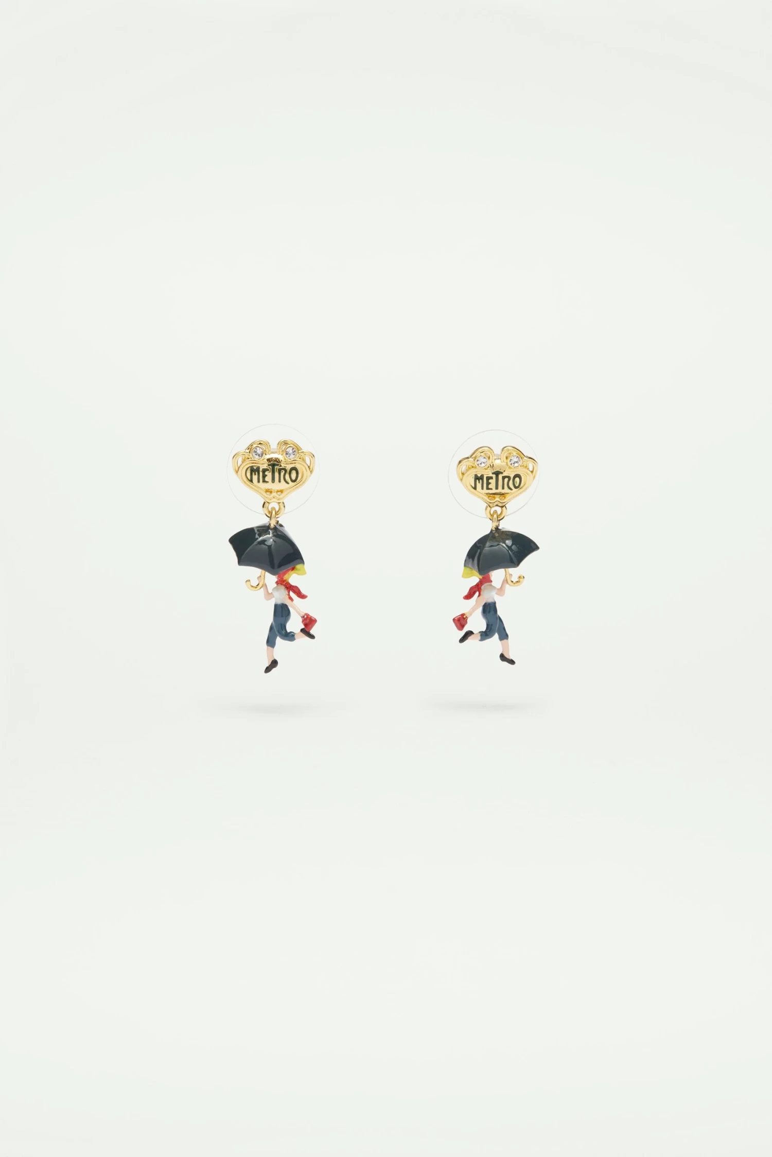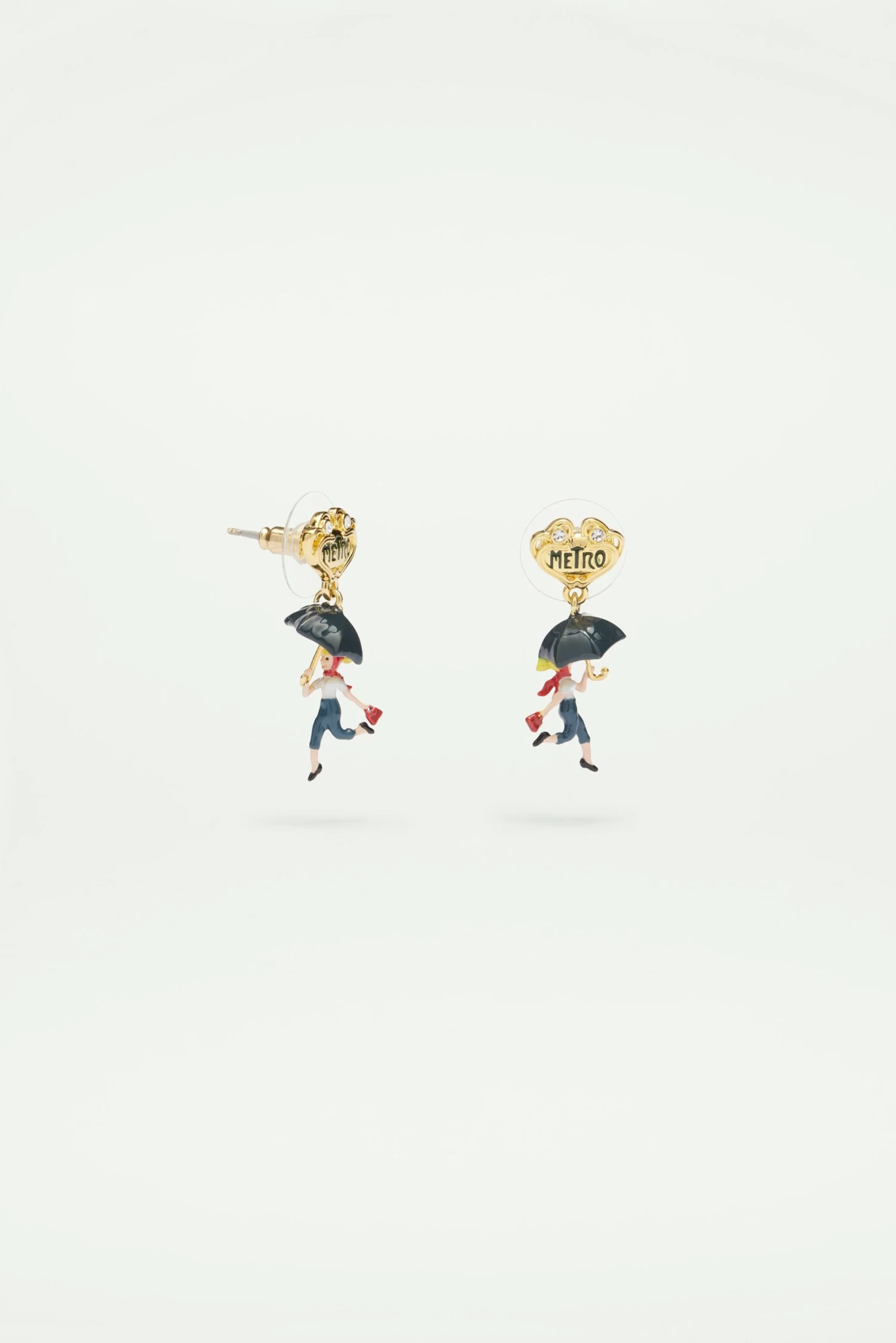 Boucles d’oreilles à tiges, femme et parapluie émaillés à la main, référence au métro parisien et à son habillage Art Nouveau.
