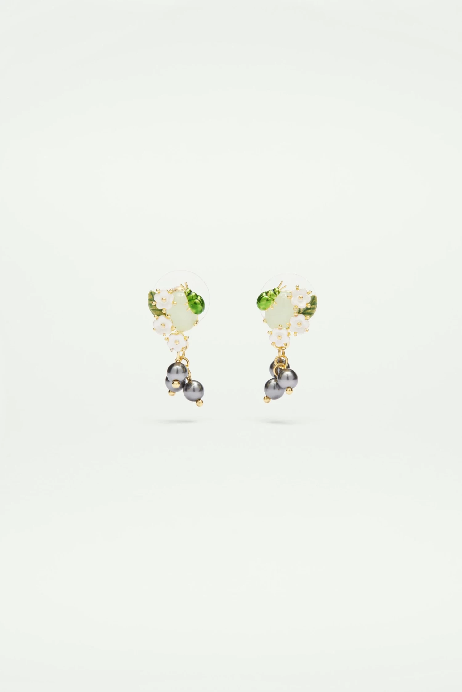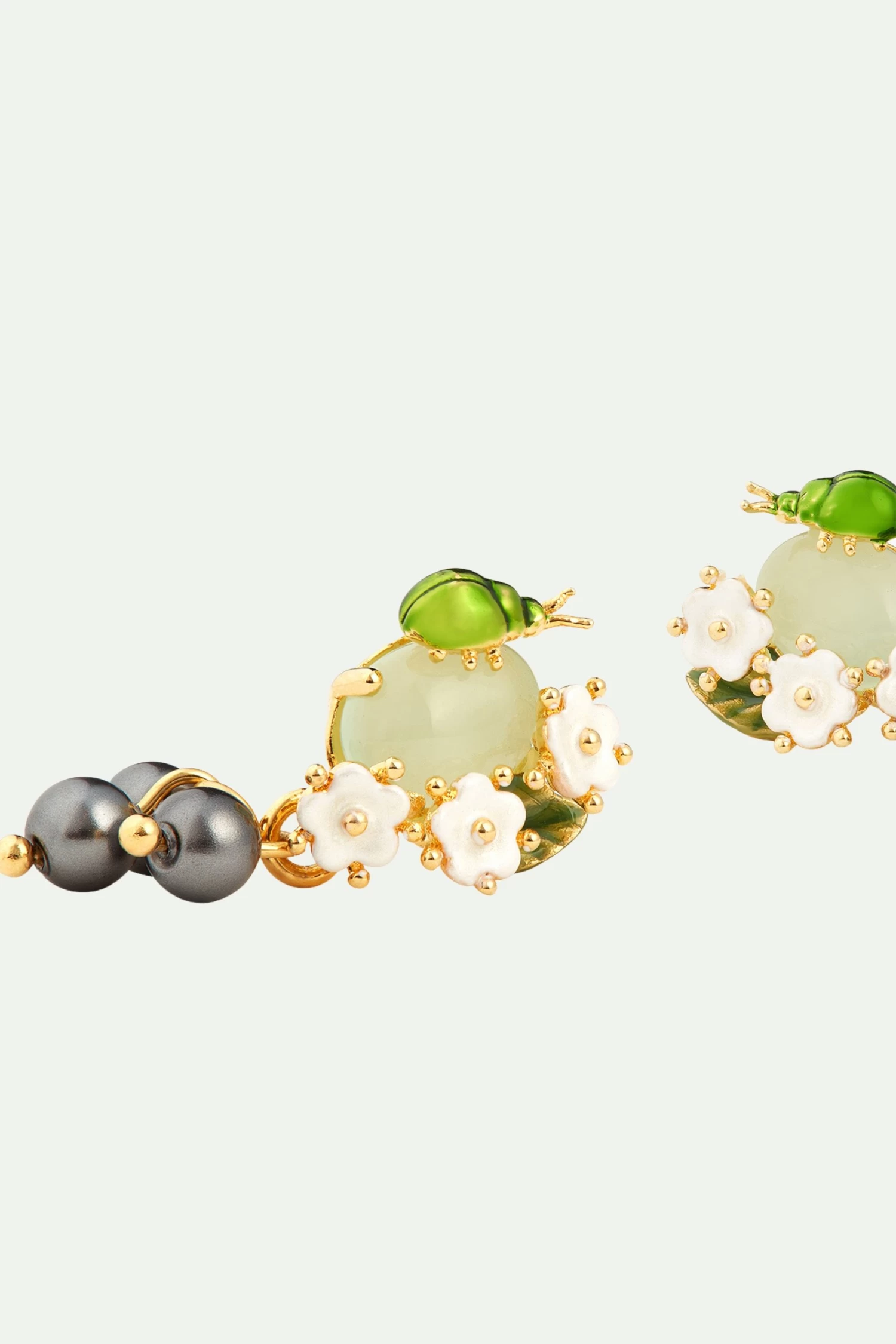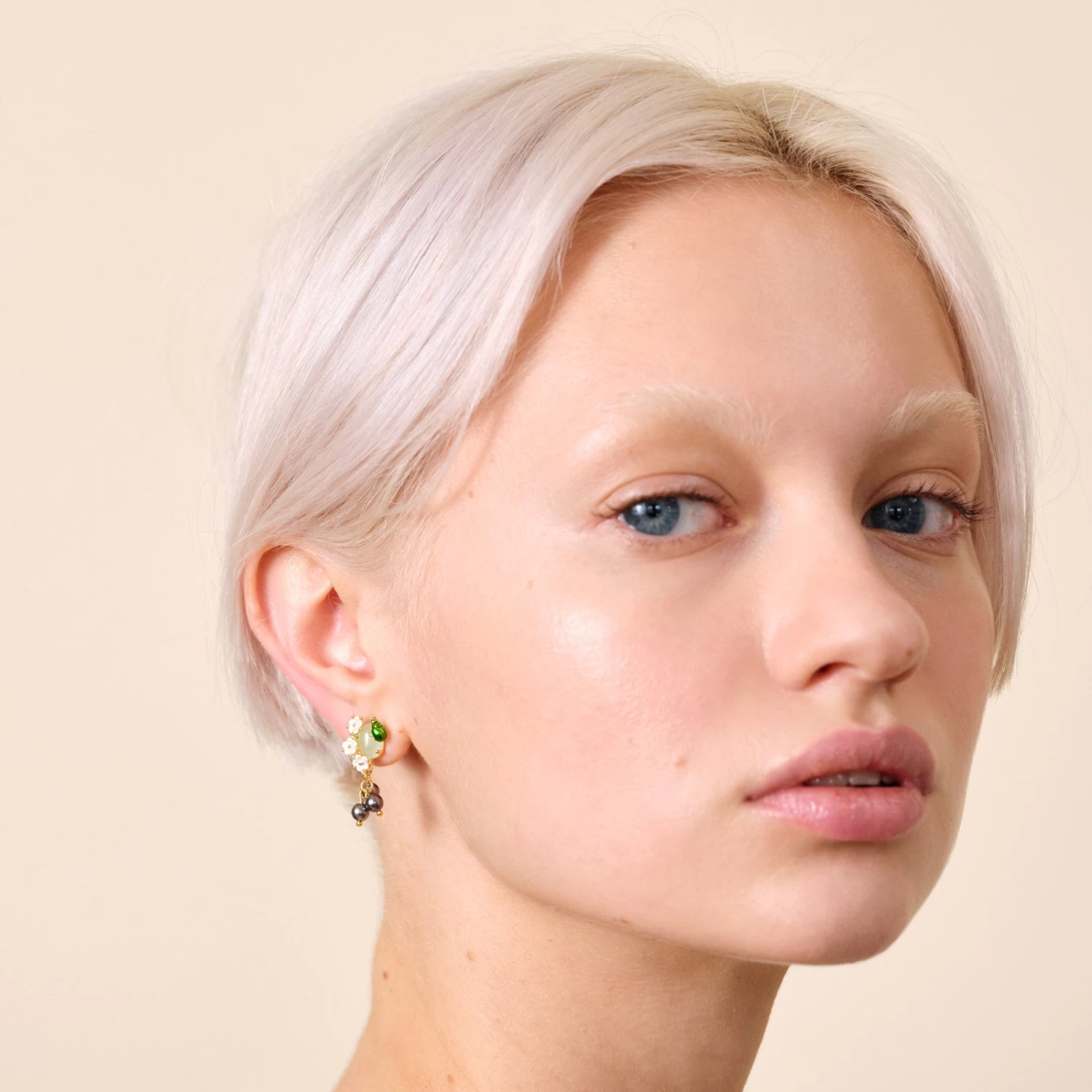 Ces boucles d’oreilles retiennent l’attention par leur mélange enchanteur de mystère et de nature. Au centre de chaque pièce, une pierre en verre taillé d’un vert olive profond, semblable à une fenêtre vers un jardin secret attire le regard par sa teinte énigmatique. S’entremêlant autour de cette gemme, trois délicates fleurs blanches semblent danser avec grâce apportant une touche de pureté et d’élégance à l’ensemble. Cependant, c’est le scarabée d’un vert intense qui vole la vedette, sa silhouette minutieusement détaillée refléte une aura de force et de résilience. Juste en dessous de cette scène envoûtante, des myrtilles sont suspendues avec une grâce naturelle. Associez cette paire de boucles d’oreilles haute fantaisie au bracelet fin myrtilles et scarabée ainsi qu’au collier pendentif myrtilles et scarabée pour composer une parure harmonieuse.