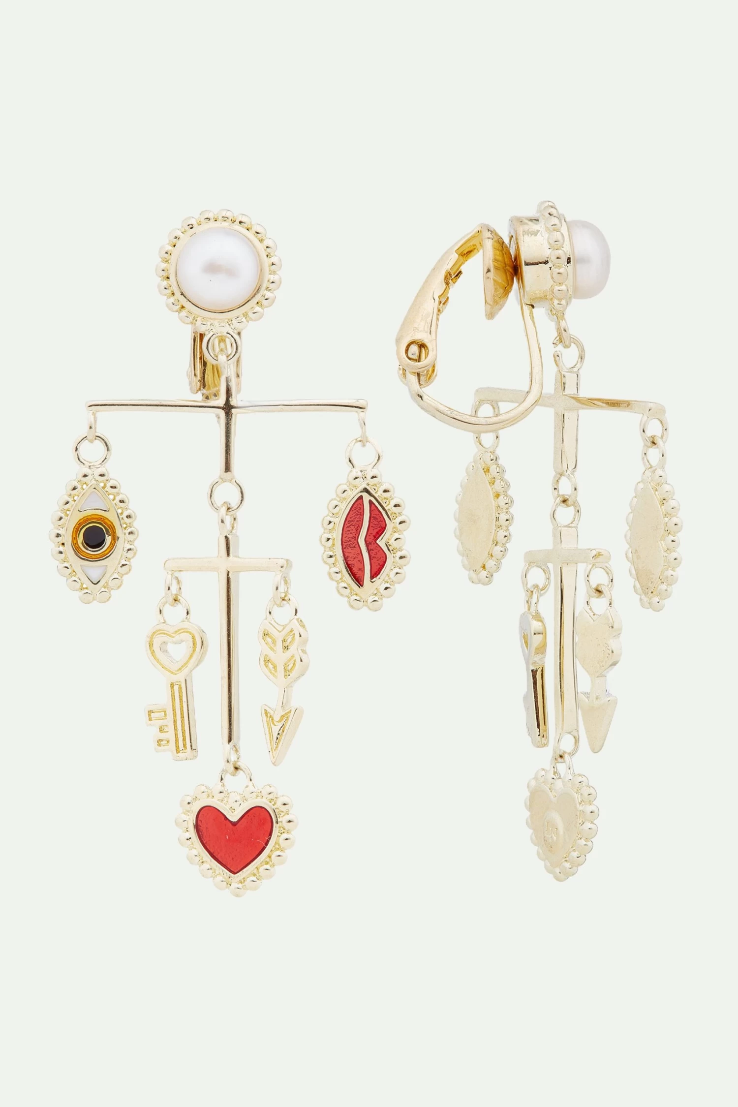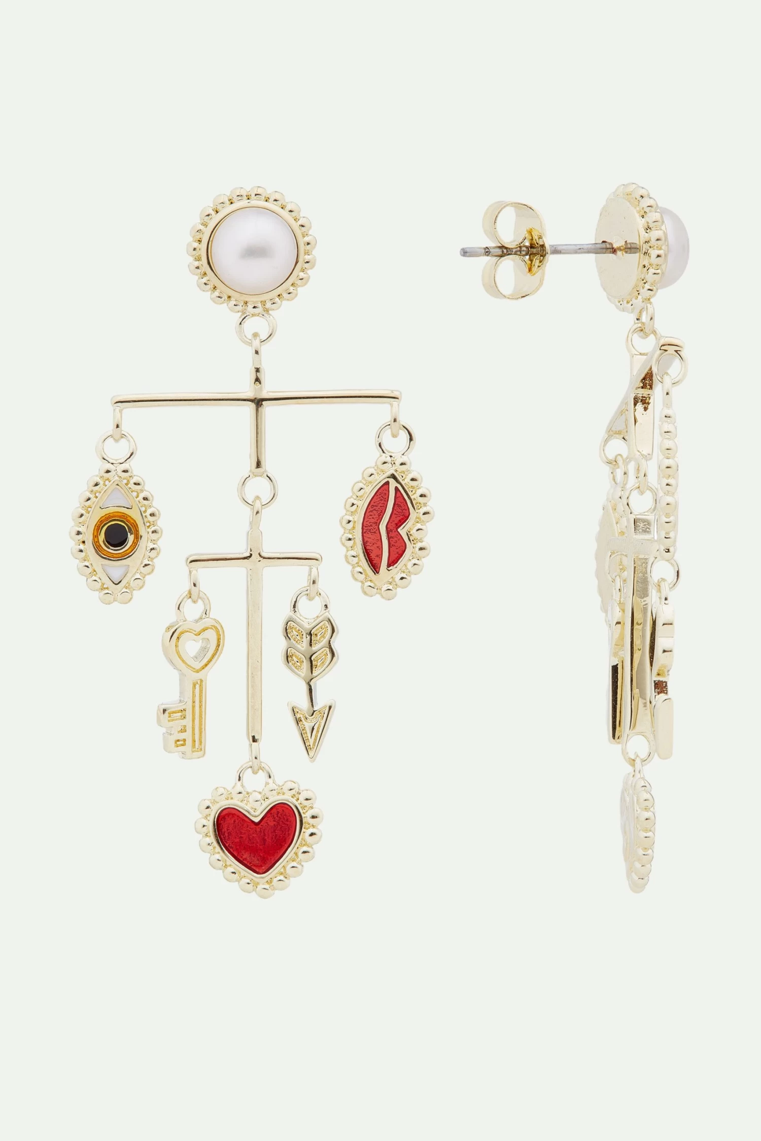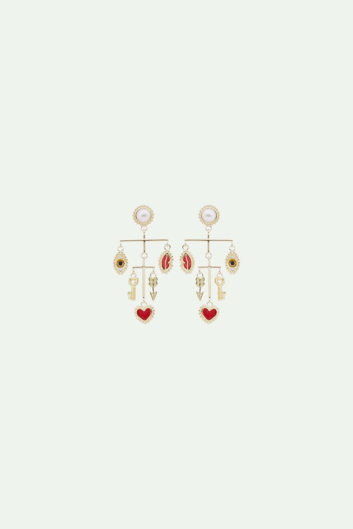 Cette paire de boucles d’oreilles tiges pendantes regroupe l’ensemble des symboles forts de la collection Art Divinatoire. On peut y apercevoir un mobile qui met en scène l’œil protecteur, les lèvres rouges, le cœur, la clé et la flèche, un ensemble de breloques dorées qui apparaissent sur d’autres bijoux de la collection. Cette paire de boucles d’oreilles s’adresse particulièrement aux personnes qui aiment les longues boucles d’oreilles volumineuses. Portée les cheveux attachés ou dégagés, cette paire saura vous mettre en valeur et épouser la forme de votre visage. Boucles d’Oreilles Tiges : laiton doré à l’or fin, émaillé à la main, contour perlé et perle de culture.