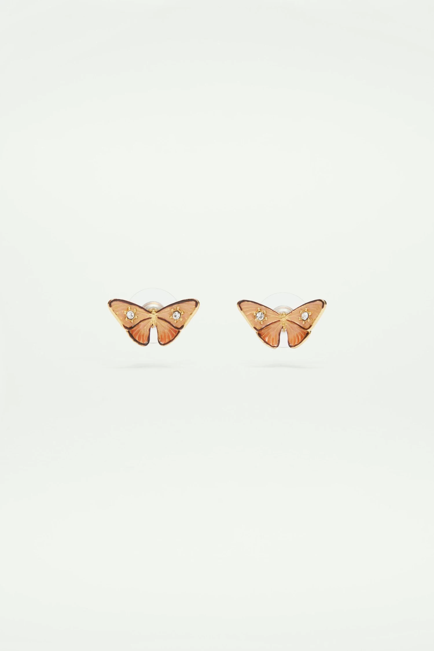 Boucles d’oreilles tiges, papillon émaillée à la main dans les tons orangés pastel, dorées à l’or fin, ornées de deux pierres en verre taillé.