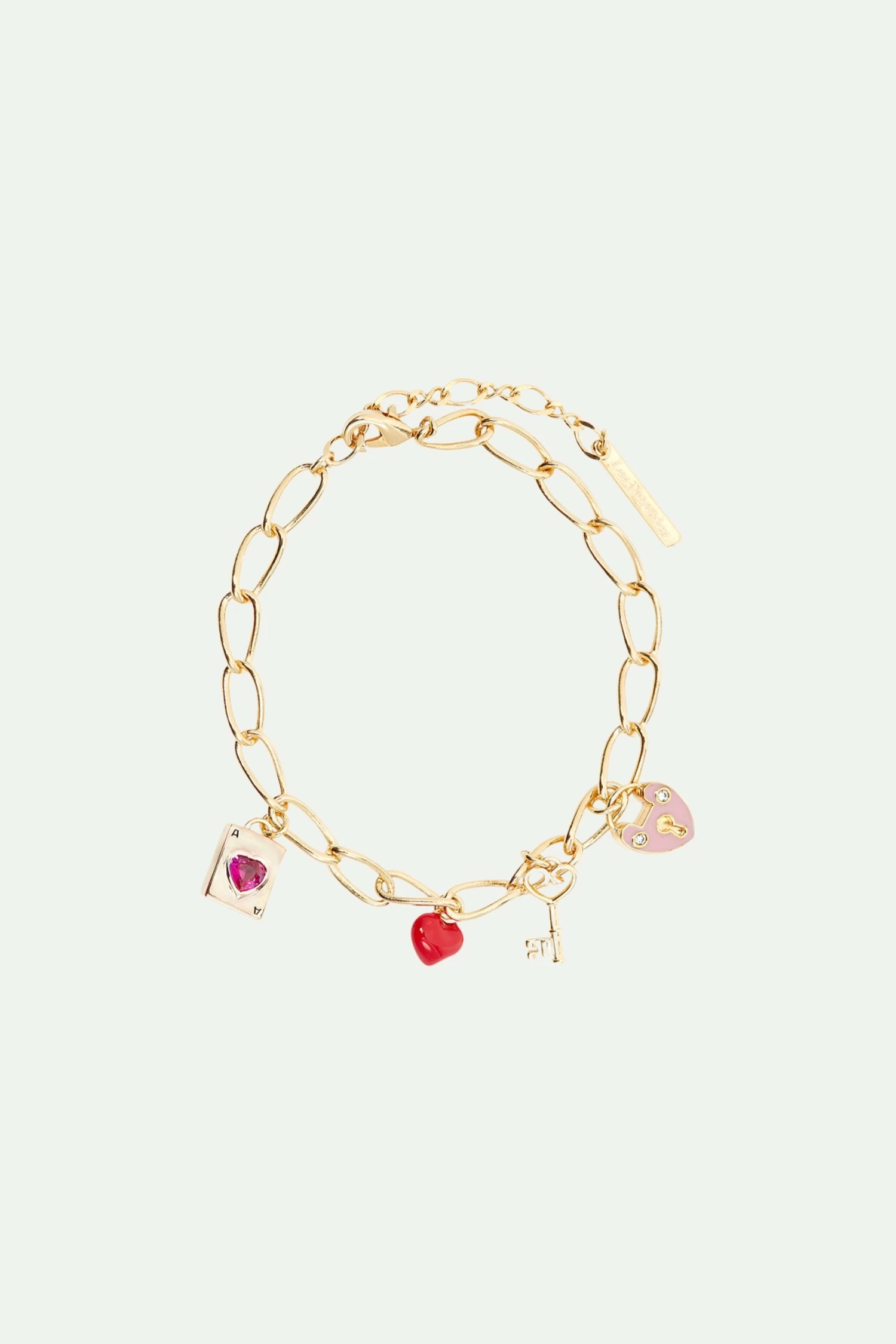 Ce bracelet chaîne rectangle composé de charm’s incarne l’amour sous toutes ses formes. Au centre, vous trouverez la carte de l’as de cœur, symbole emblématique de la passion. Ce bracelet fantaisie comprend également un charm’s en forme de cadenas, symbolisant la sécurité et la fidélité dans une relation. Et enfin, une petite clé est présente, symbolisant l’ouverture du cœur et la confiance mutuelle. Laissez ce bracelet chaîne rectangle et charm’s d’amour vous rappeler la beauté des liens affectifs et l’importance de chérir les moments partagés. Portez-le avec fierté et laissez sa symbolique puissante illuminer votre poignet. Bracelet Fin : Laiton doré à l’or fin, cristal facetté, oxydes de zirconium et chaîne.