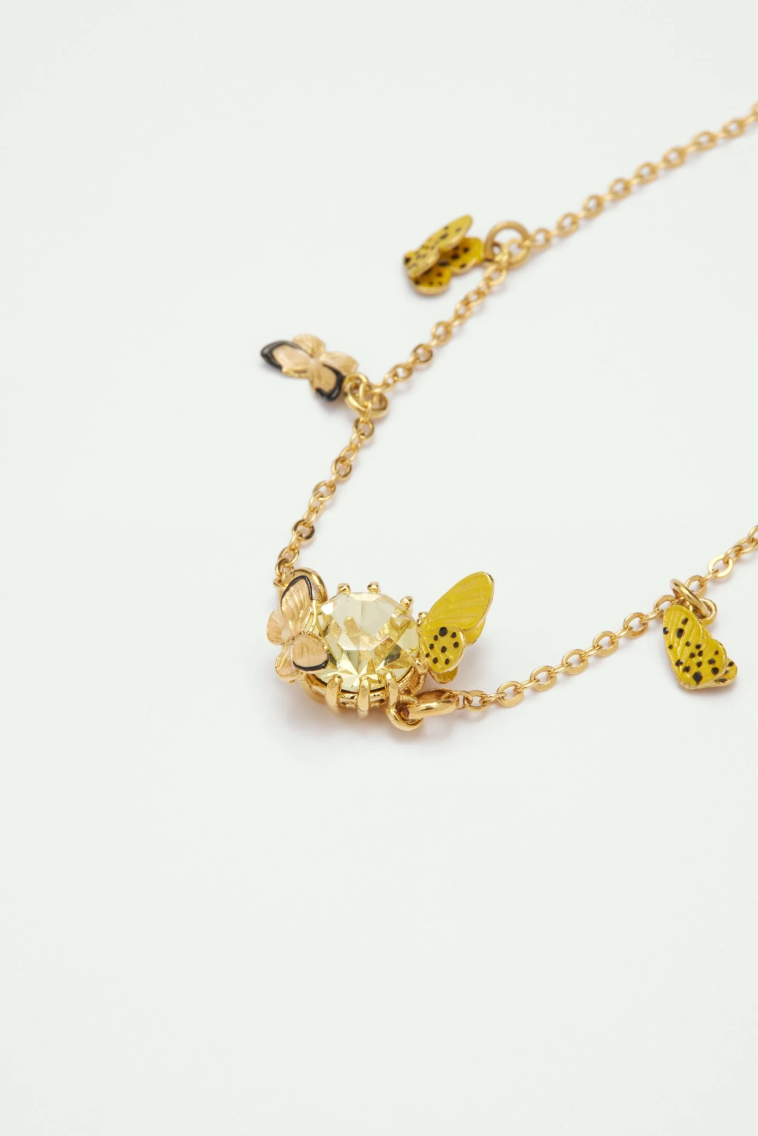 Bracelet Charm’s, papillons colorés émaillés à la main dans des tons pastel, chaine en laiton doré à l’or fin, pierre en verre taillé ronde dorée.