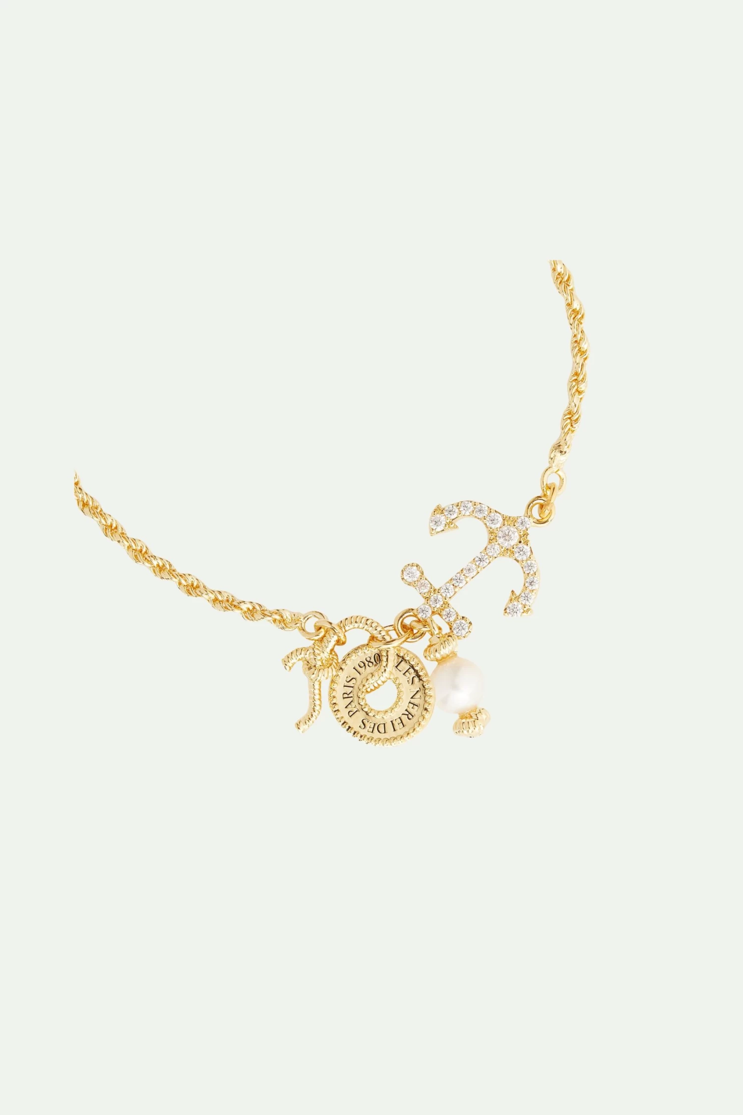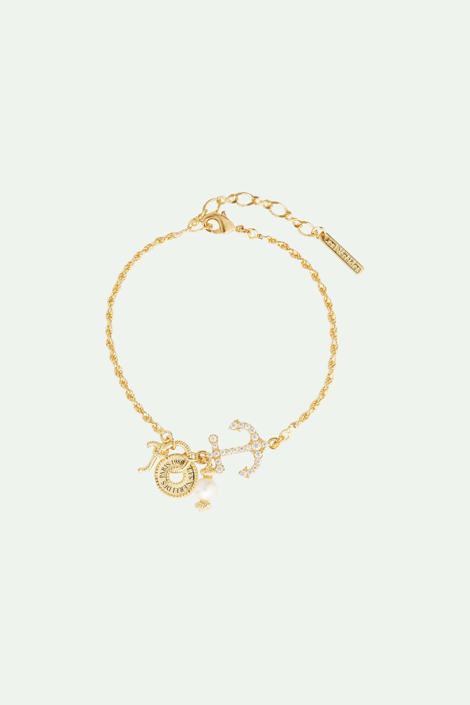 A la recherche d’un bracelet ancre marine pour femme? Ce bracelet ancre dorée et ses brillants apportent raffinement et chic à vos tenues du quotidien. Une perle blanche ainsi qu’une pièce gravée Les Néréides accompagnent ce bracelet maille torsadée dorée. Bracelet Fin : Laiton doré à l’or fin, perle de culture, cristal taillé