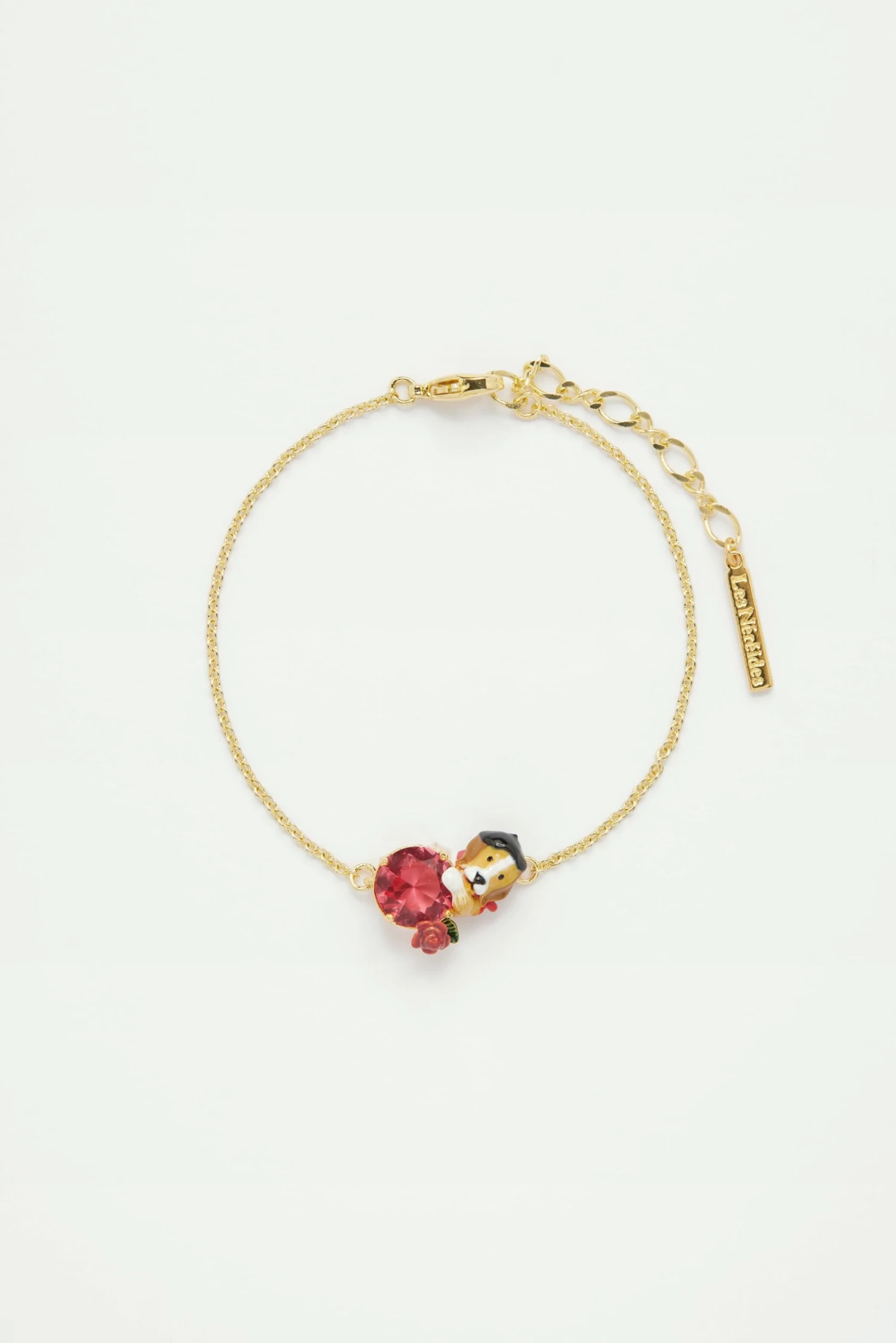Bracelet fin, chien beagle et rose émaillés à la main, ornée d’une pierre en verre taillé rose.