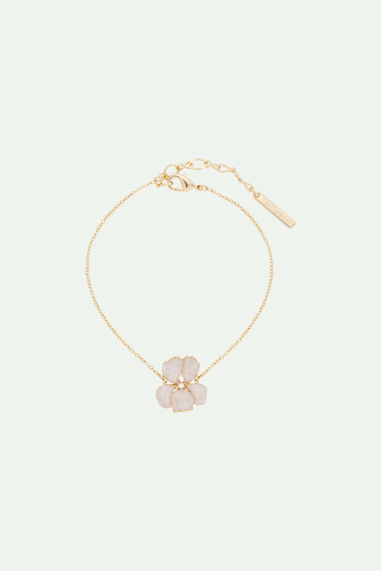 Sur cette fine chaîne dorée à l’or fin, se trouve une fleur d’iris blanche, ornée d’un cristal blanc scintillant en son centre. Succombez à la beauté de ses grands pétales faisant penser à des petits nuages de coton. Bracelet Fin : Laiton doré à l’or fin et cristal.