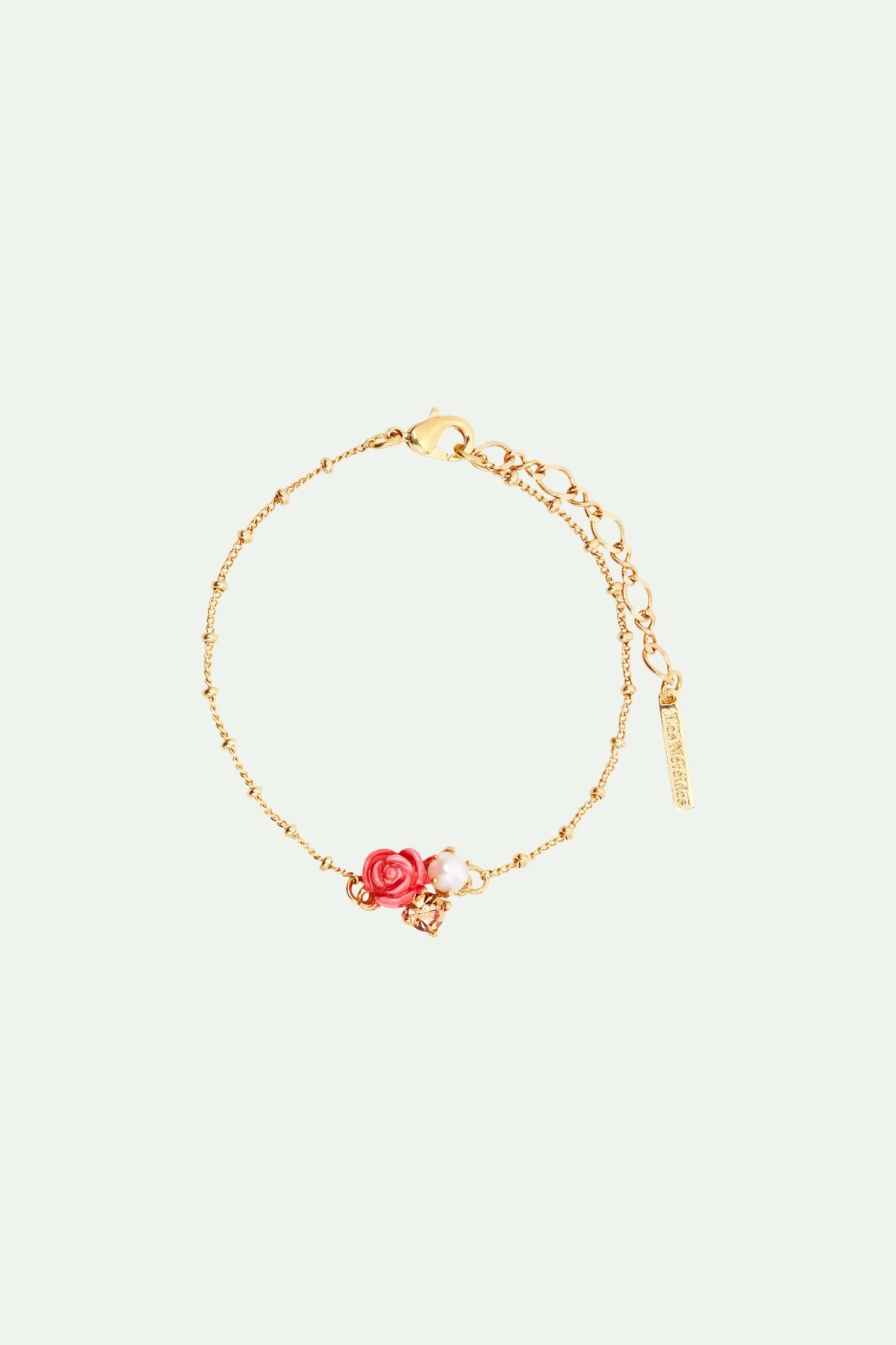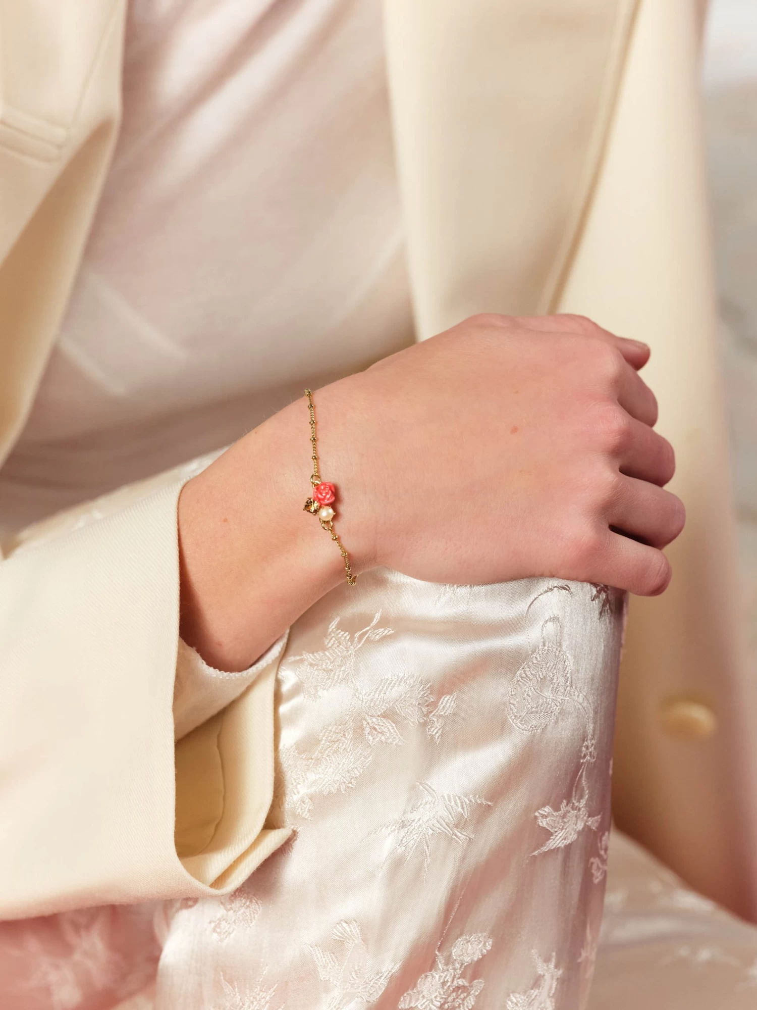 Ce bracelet est une création de la collection Antica Rosa, qui tire son inspiration d’une roseraie oubliée au charme romantique. Il est composé d’un trio d’éléments de bijouterie : une perle de culture, une pierre ronde facettée et une rose émaillée, tous montés sur une fine chaîne dorée à l’or fin. La perle de culture, semblable à un bouton de rose, est également présente sur d’autres créations de bijoux fantaisie de cette collection poétique. Ce bracelet sera un cadeau idéal à offrir à votre mère ou à une amie chère à votre cœur. Bracelet Fin : Laiton doré à l’or fin, émaillé à la main, perle de culture.
