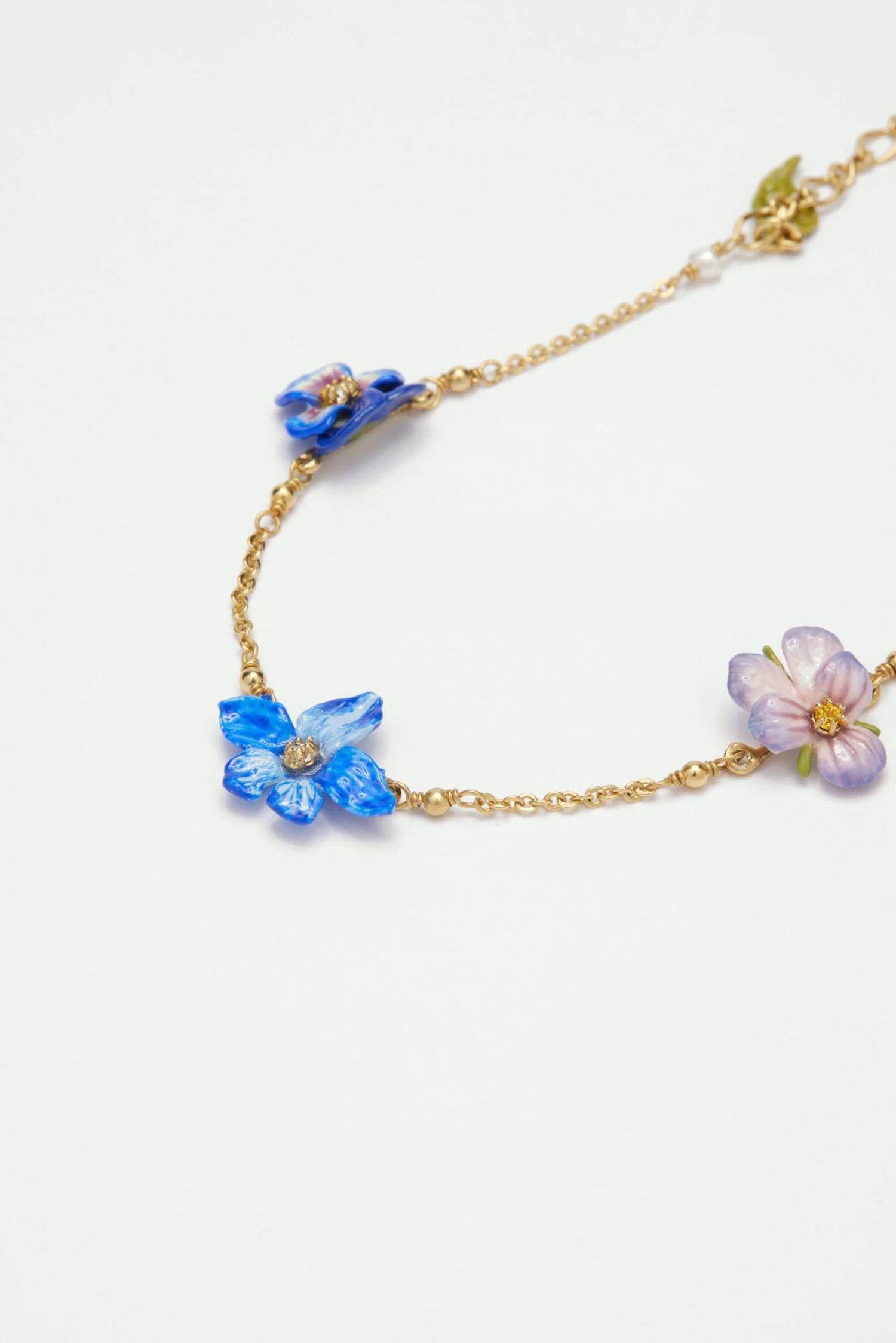 Le bracelet fin violette et pensée de la collection Mille Pensées vous offre trois jolies fleurs émaillées à la main, montées sur une fine chaîne doré à l’or fin. Un bijou fantaisie pour femme, d’inspiration florale, toute en légèreté, ces fleurs d’hiver aux couleurs bleutées et parmes, sont emplies d’une douce nostalgie. La Maison Les Néréides signe un bijou tendance, finement émaillée à la main, que vous pourrez combiner en parure avec les boucles d’oreilles violette et perle baroque.