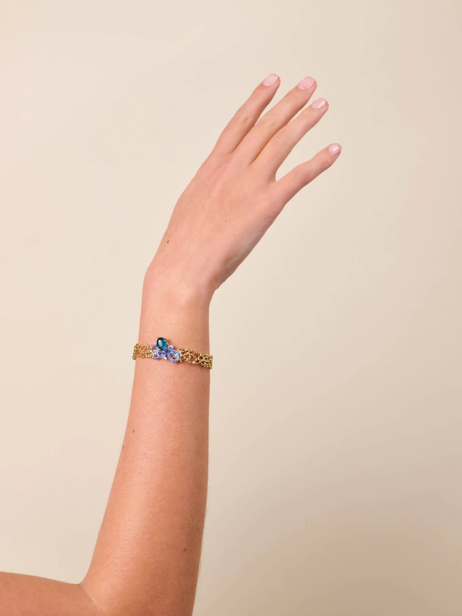 Ce bracelet jonc doré évoque la puissance mystérieuse de la pieuvre. Il présente avec élégance une pieuvre bleue, dont la tête est une pierre en verre taillée d’un bleu profond incarnant la splendeur de l’océan. La pieuvre délicatement émaillée à la main repose avec prestance sur le jonc. Chaque détail du bracelet souligne la majesté et la grâce de cette créature marine fascinante. N’hésitez pas à l’associer avec la broche pieuvre bleue, pierre en verre taillé bleu et perle nacrée de la collection La Splendeur des Profondeurs.