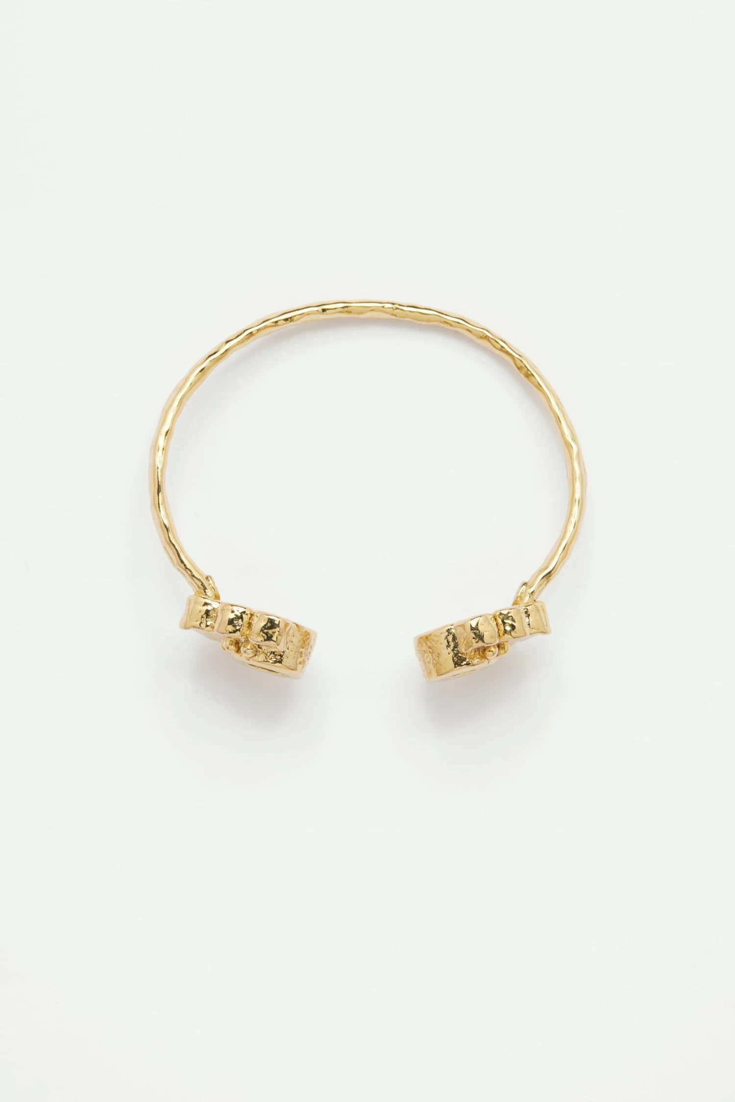 Bracelet jonc en laiton doré à l’or fin, deux incrustation en résine. Résine façon terrazzo faite d’éclats de malachite, œil de tigre et obsidienne neige.