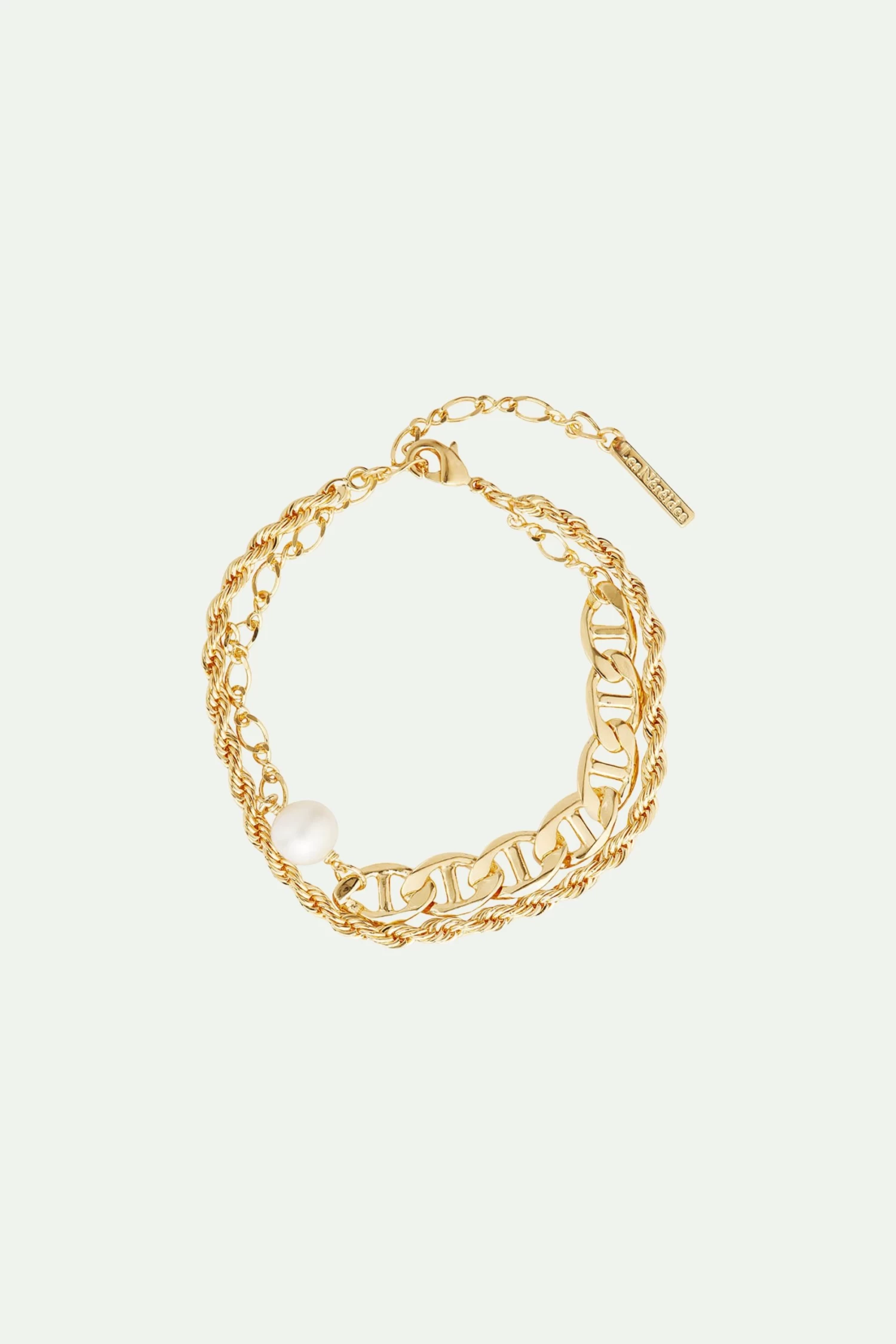 Inspiré des cordages marins ce bracelet pour femme offre deux chaines aux maillages différents, une maille torsadée et une maille marine plus épaisse. Succombez à la tendance bracelet maille dorée avec ce bracelet fantaisie et sa perle blanche de la collection Maillage Précieux signée Les Néréides. Vous pouvez compléter votre look en accompagnant ce bracelet avec le collier maille dorée de la même collection. Bracelet Fin : Laiton doré à l’or fin, perle de culture