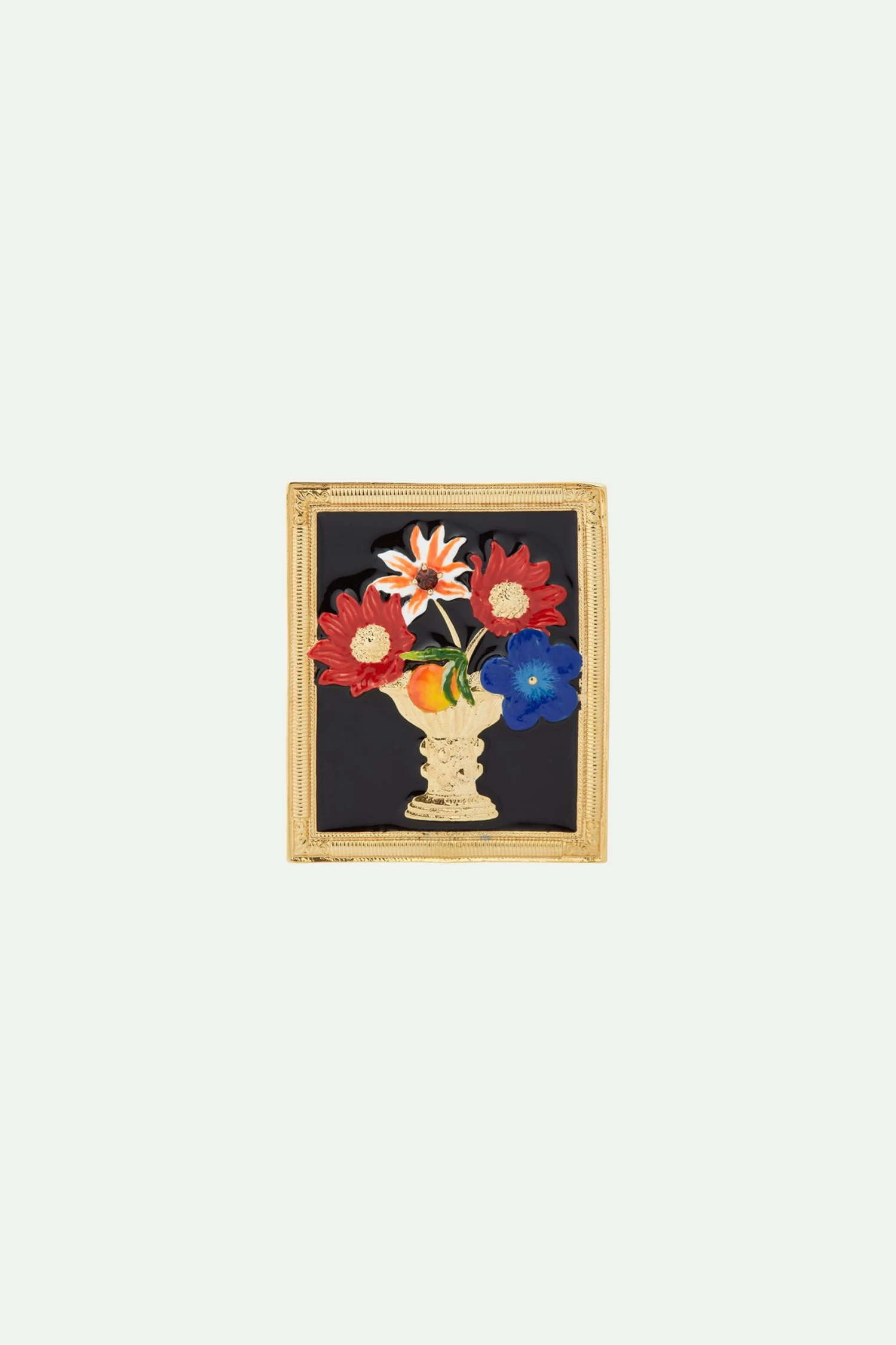 Découvrez cette broche emblématique de la collection Tableau de Maître, qui incarne à elle seule l’inspiration globale de cette parure de bijoux fantaisie, inspirée des toiles des peintres flamands représentant les natures mortes. Cette broche présente un véritable tableau encadré de doré, mettant en scène une coupe contenant des fleurs rouges, une fleur bleue et une clémentine, le tout sur un fond noir. Accrochée à une veste ou à un foulard, cette broche sera le cadeau idéal pour les amateurs de natures mortes et d’art en général. Broche : Laiton doré à l’or fin émaillé à la main.