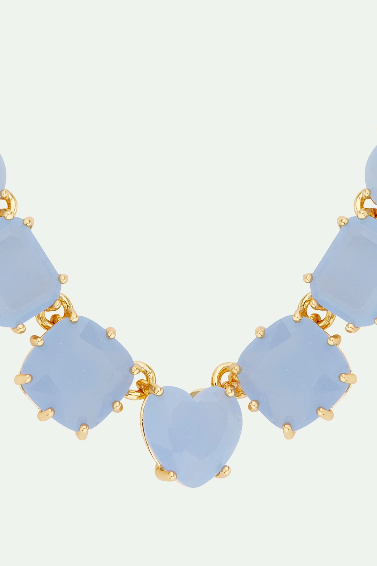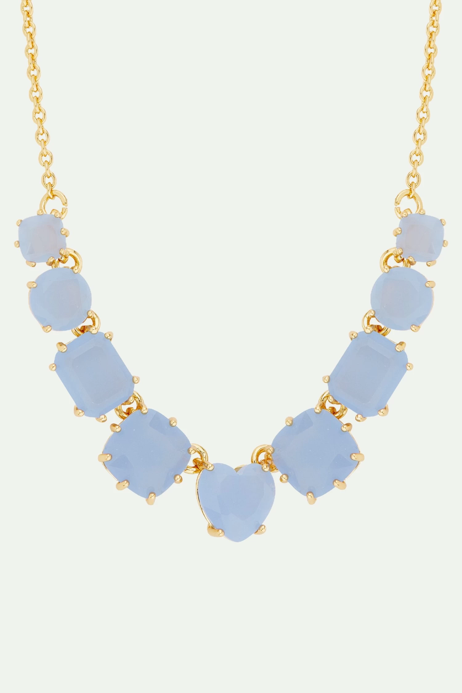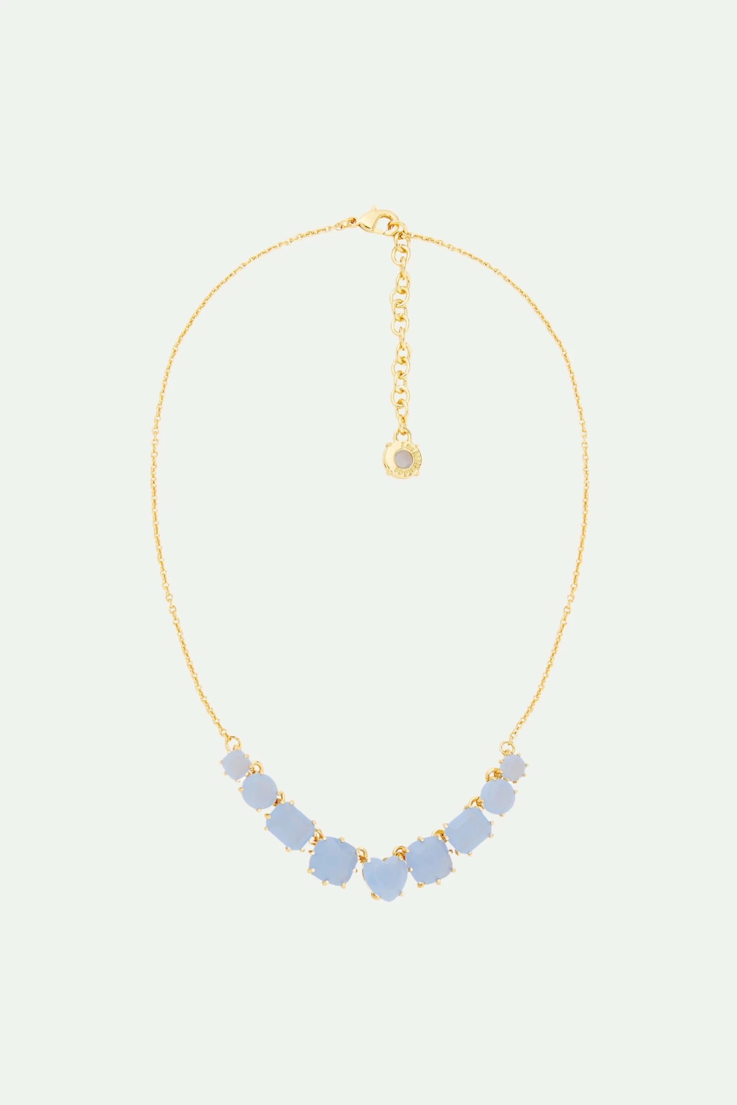 Si vous aimez l’ensemble des modèles La Diamantine, ce collier est fait pour vous. Il regroupe les différentes formes géométriques présentes sur tous les modèles de cette collection iconique. Du coeur au rond, en passant par les pierres de taille coussin de forme carrée et rectangulaire. Pour obtenir la parure complète, vous pouvez associer ce collier au bracelet fin 5 pierres La Diamantine bleu ciel. Collier Fin : Laiton doré à l’or fin, verre facetté.
