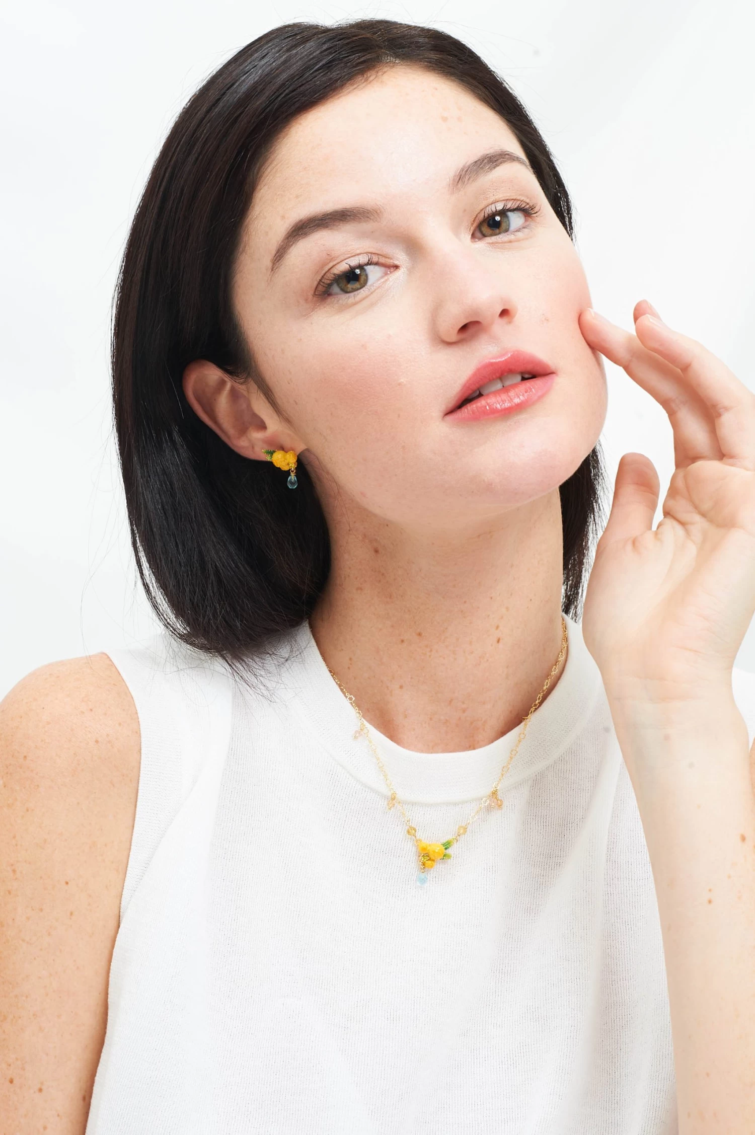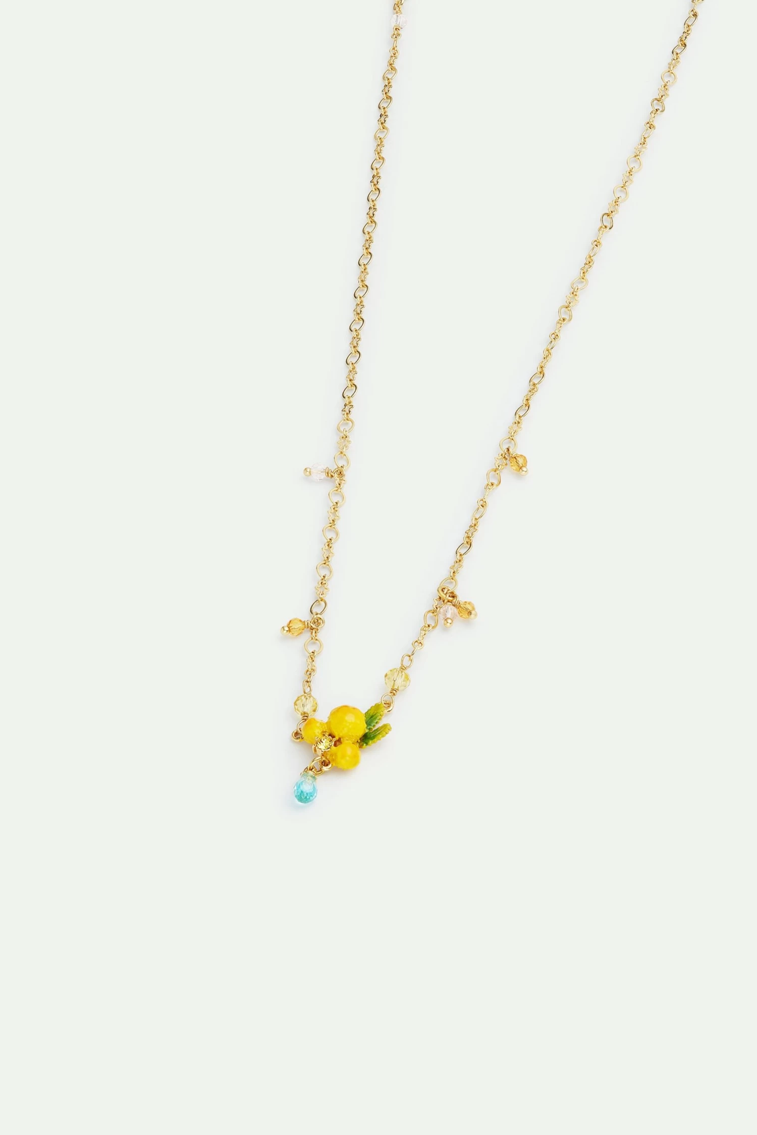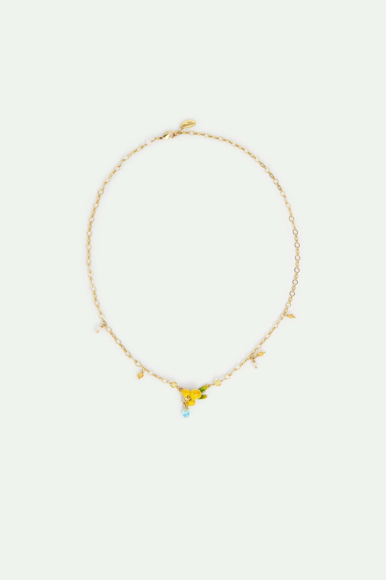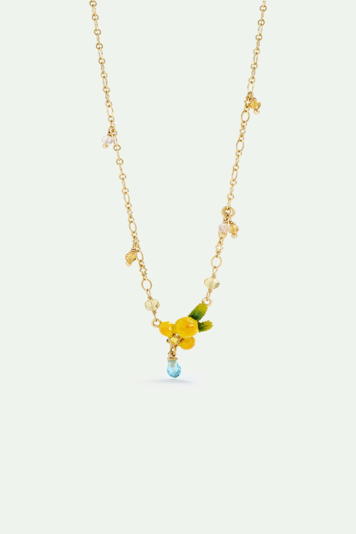 Le collier pendentif fleur de mimosa et petites perles de la Collection Jardin de Provence est composé d’une chaine de laiton doré à l’or fin 14 carats et de maillons agrémentés de perles de verre orangées. Bijou fruité et coloré, il nous invite à rêvasser de balades provençales guidées par le chant des cigales. Les éléments fruits provençaux et feuillages sont réalisés en laiton émaillé et en résine 3D dans la plus pure tradition de La Maison Les Néréides. Un verre bleu ciel taillé, suspendu au collier, vous comblera de douceur.