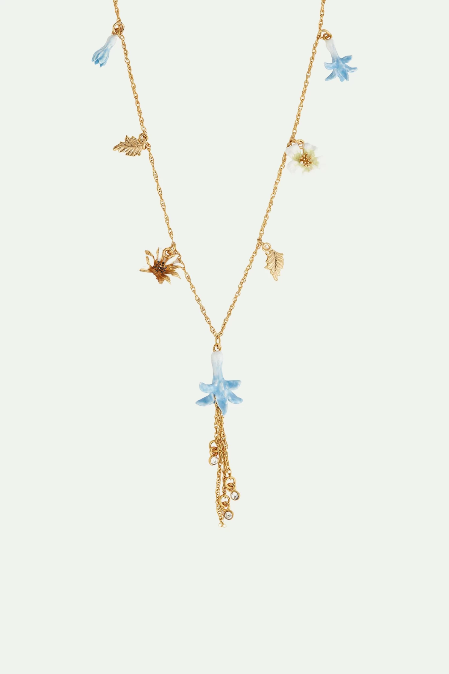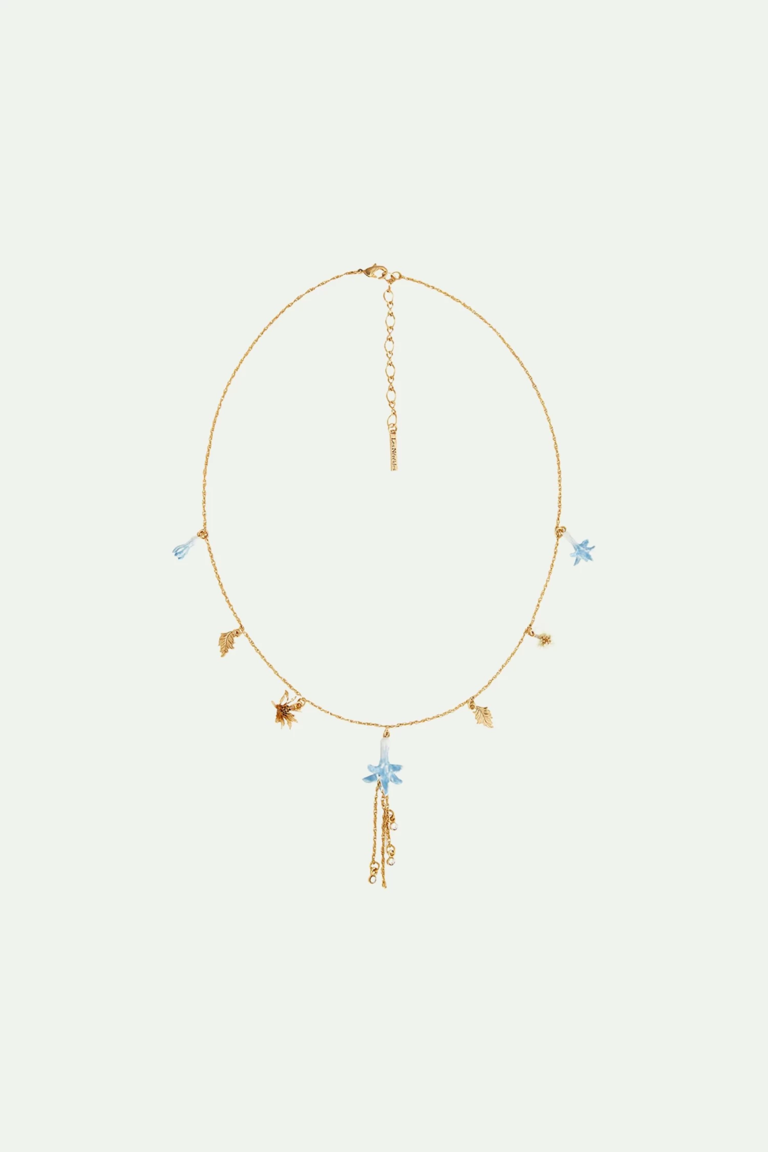 Ce collier raffiné de la collection Tableau de Maître présente un ensemble d’éléments suspendus sur une délicate chaîne dorée à l’or fin. Le pendentif principal met en avant une fleur en train de se faner, ornée de petits cristaux scintillants suspendus à de fines chaînettes dorées. Une fleur blanche et une fleur dorée, accompagnées de feuilles couleur or, viennent compléter cette création originale, signée la Maison Les Néréides. Collier Pendentif : Laiton doré à l’or fin émaillé à la main et verre facetté.