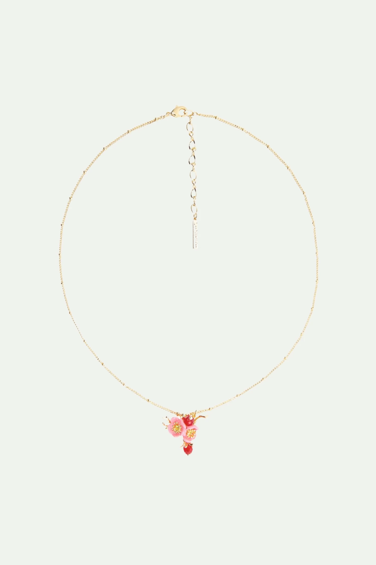 Faites l’expérience d’une fusion délicate entre le style poétique de La Maison Les Néréides et l’univers japonisant de la collection Plumes d’Automne, faisant partie du grand thème Bassin Japonais. Ce collier se compose d’une chaîne perlée dorée, délicatement ponctuée de bourgeons rouges évoqués par des perles de verre. En cascade tombent des fleurs de prunier, avec leurs pétales d’une nuance rose poudré, évoquant la beauté des jardins japonais à l’aube de l’automne. Imprégné de l’esprit zen japonais, ce collier est une représentation artistique de la nature, en harmonie avec le style de vie moderne. Il s’adresse aux femmes audacieuses qui apprécient l’originalité, la simplicité et le raffinement dans leur bijouterie. Ce collier est le choix parfait pour celles et ceux qui cherchent à exprimer leur individualité tout en restant ancrés dans une esthétique traditionnelle. Collier Pendentif : Laiton doré à l’or fin, émaillé à la main et verre facetté.
