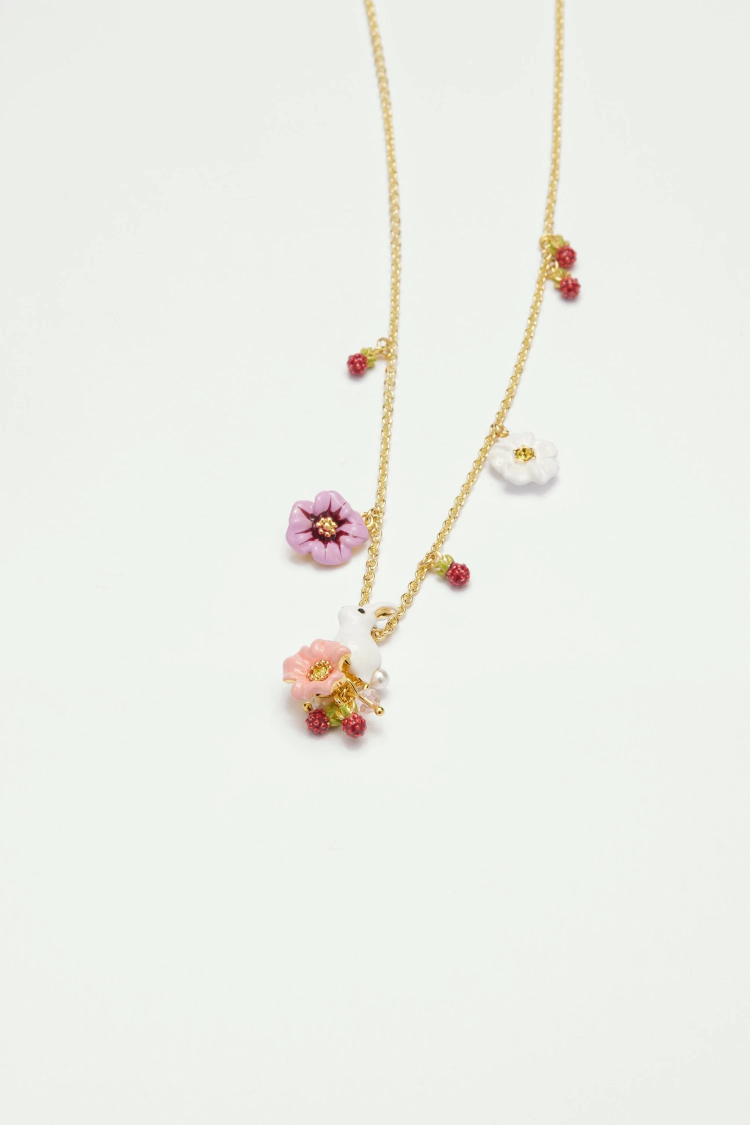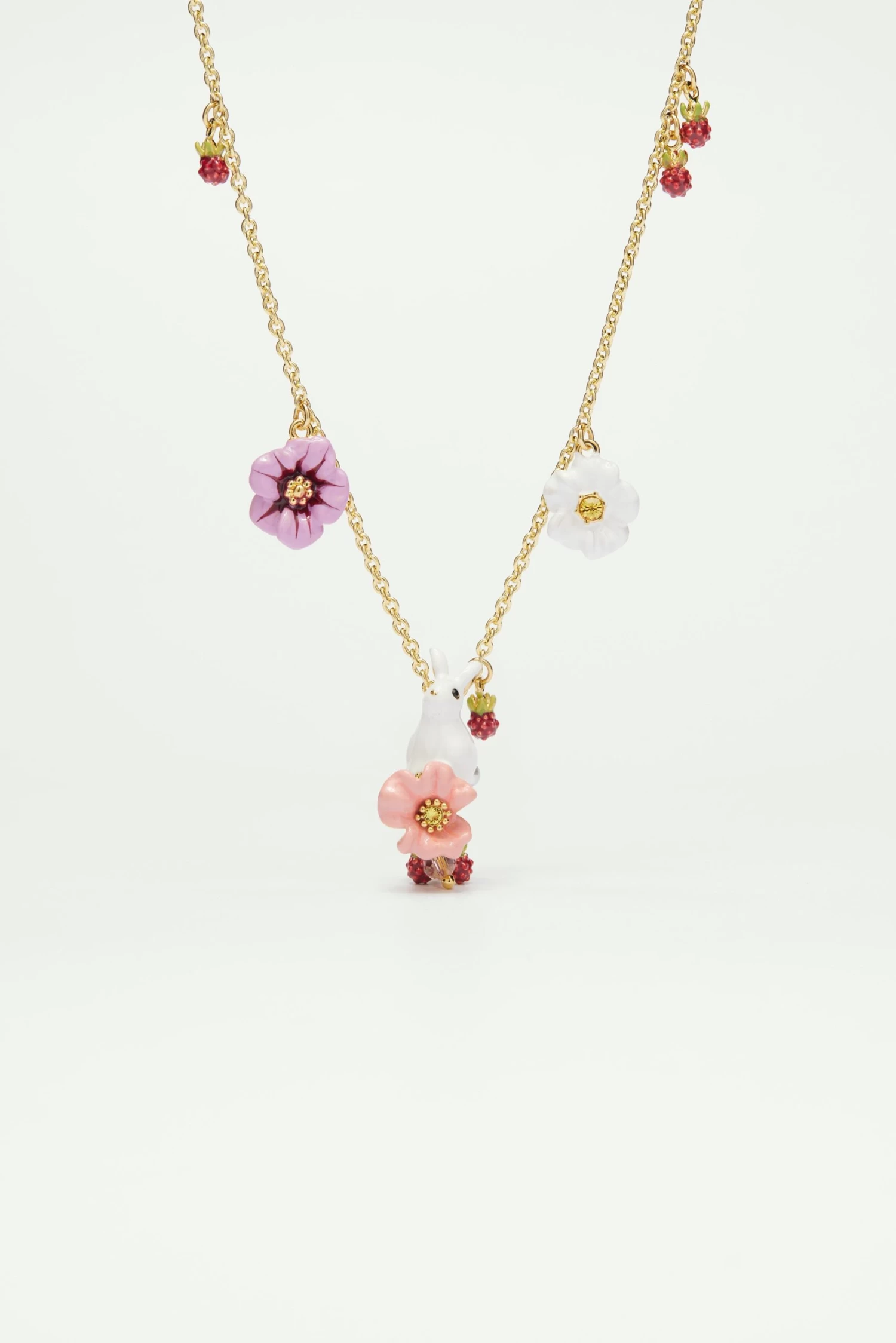 Ce sautoir pour femme de la Collection Rencontre Enchantée fait partie des bijoux anniversaire de la Maison Les Néréides et met en scène un charmant lapin blanc entouré de fleurs et fruits des bois.