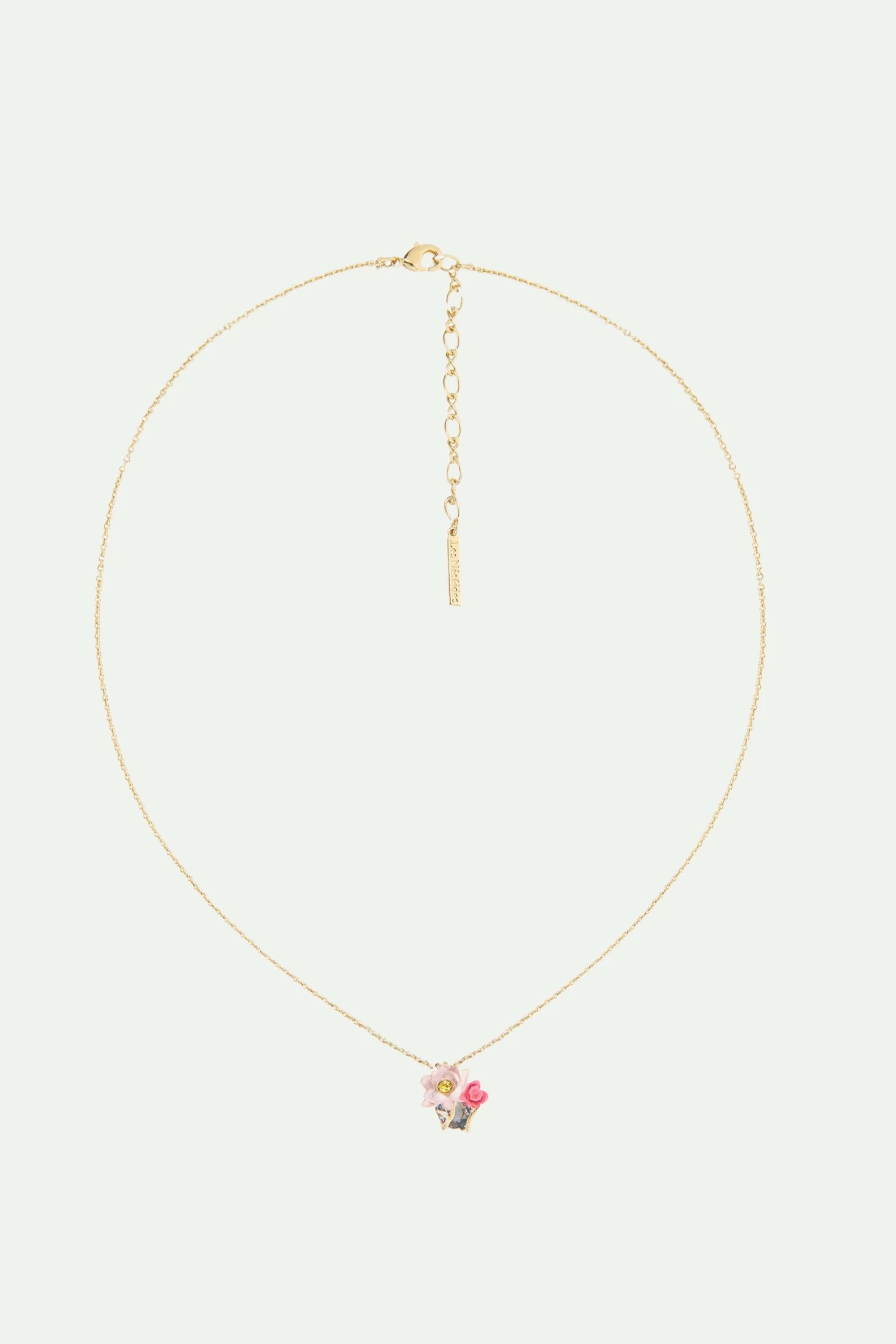 Ce collier fin est inspiré d’un étang japonais, son pendentif délicatement posé sur une pierre en verre facetté couleur aigue-marine met en valeur un lotus rose et une fleur de prunier. Les roseaux dorés qui entourent la pierre ajoutent une touche de raffinement à ce bijou pour femme, idéal pour rehausser une tenue classique. Il est également disponible en boucles d’oreilles dormeuses et boucles d’oreilles clips, permettant ainsi de créer une parure complète. Collier Pendentif : Laiton doré à l’or fin, émaillé à la main, cristal facetté.