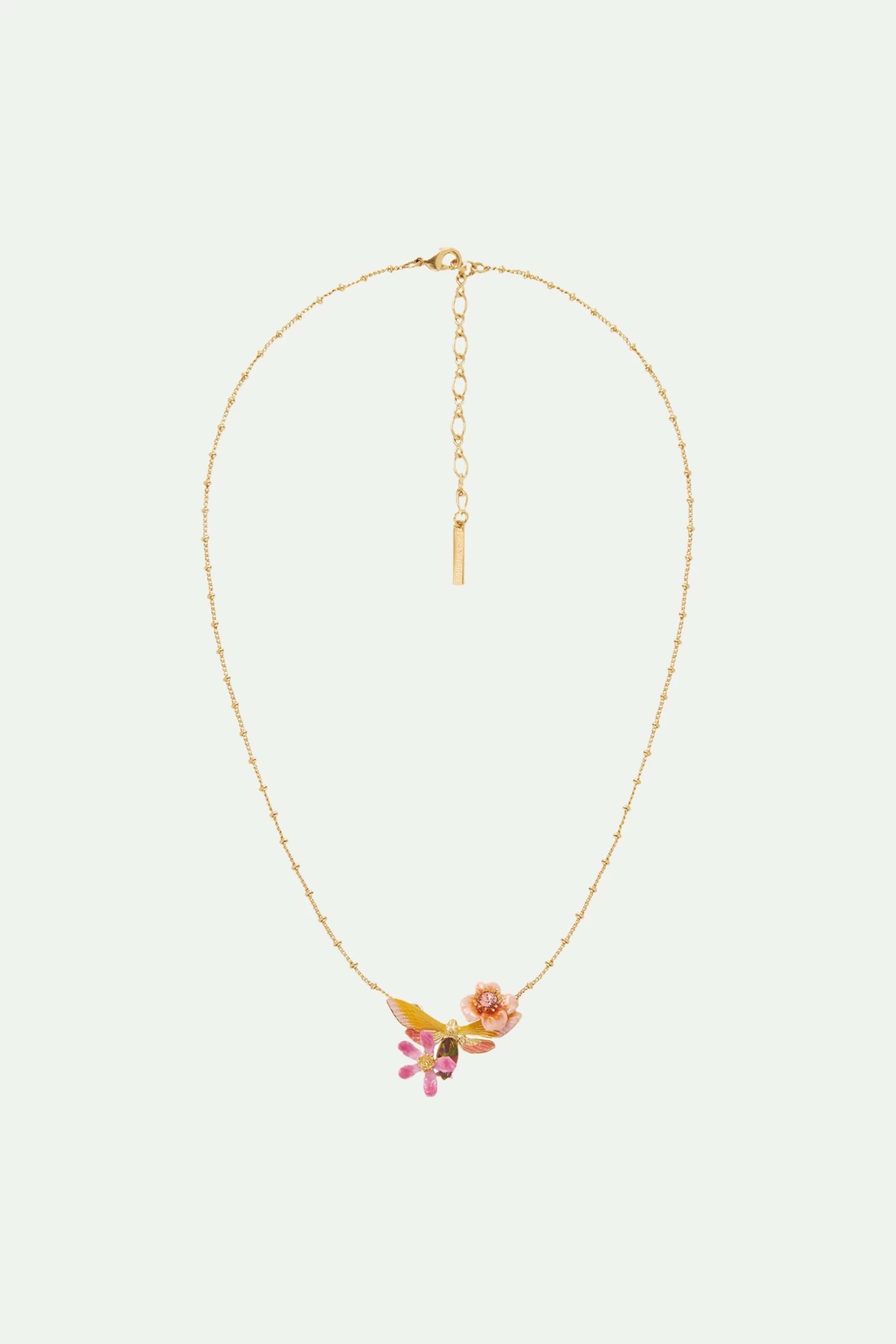 Arborez ce collier pendentif discret de la collection Vignoble en Toscane qui se compose d’un papillon des vignes de couleur jaune et qui est sertie d’une pierre de verre irisée. Une fleur de pêcher sertie d’un cristal taillé ainsi qu’une fleur rose s’ajoute a cette composition bucolique. Collier Pendentif : Laiton doré à l’or fin et émaillé à la main, cristal taillé
