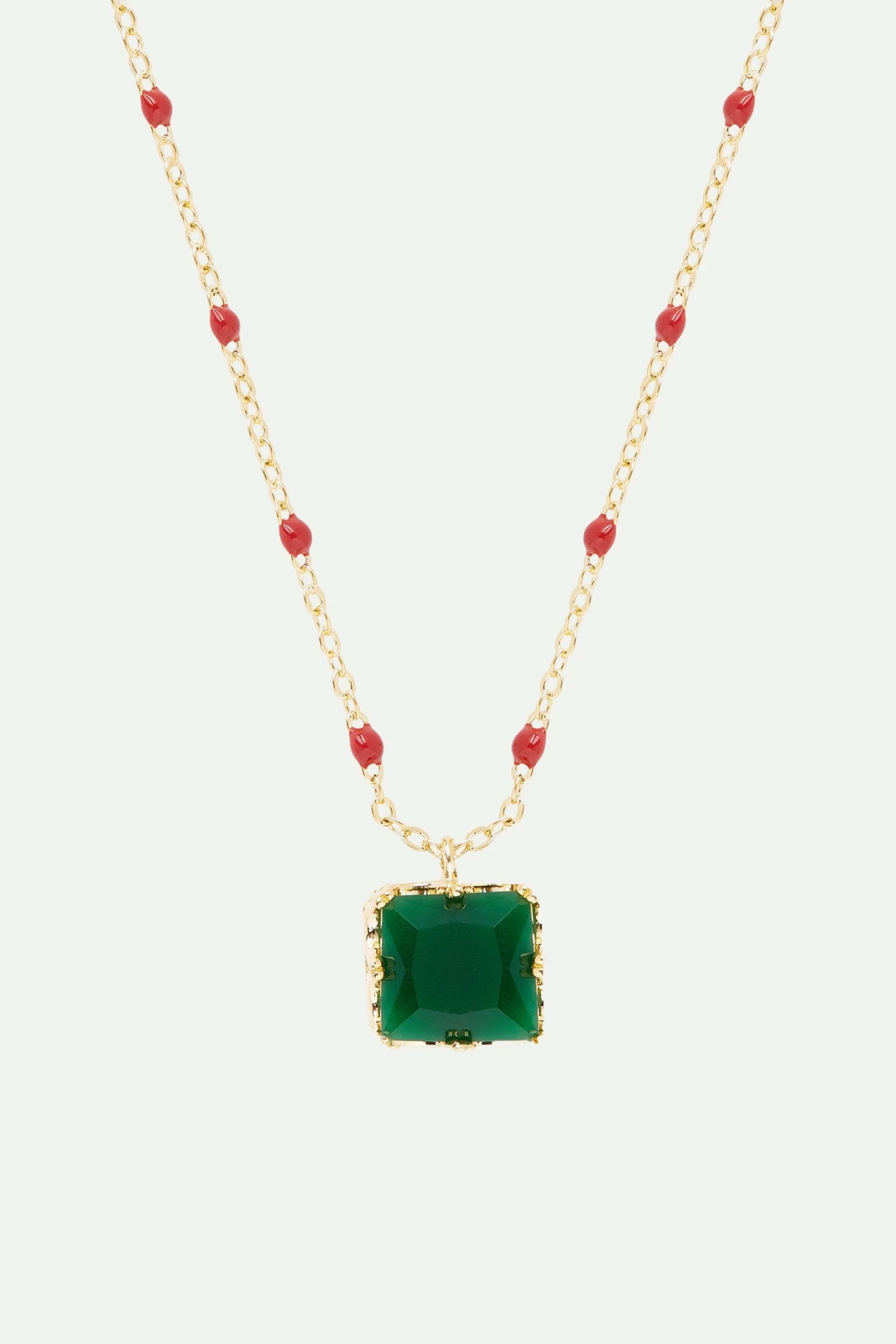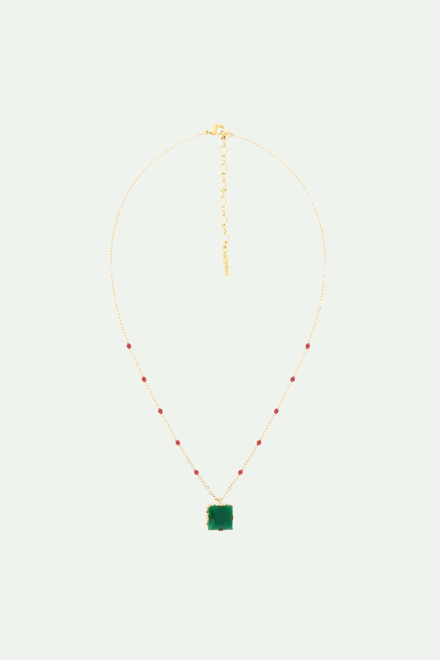 Ce collier délicat se caractérise par une pierre facettée verte éblouissante, disposée au milieu d’une chaîne dorée élégante et moderne. Avec ses couleurs chatoyantes, ce bijou de créateur est le choix idéal pour ajouter un brin de gaieté à votre poignet. Vous pouvez associer ce collier fantaisie au bracelet fin pierre carrée verte de la même collection. Collier Pendentif : Laiton doré à l’or fin, verre facetté et fine chaîne dorée