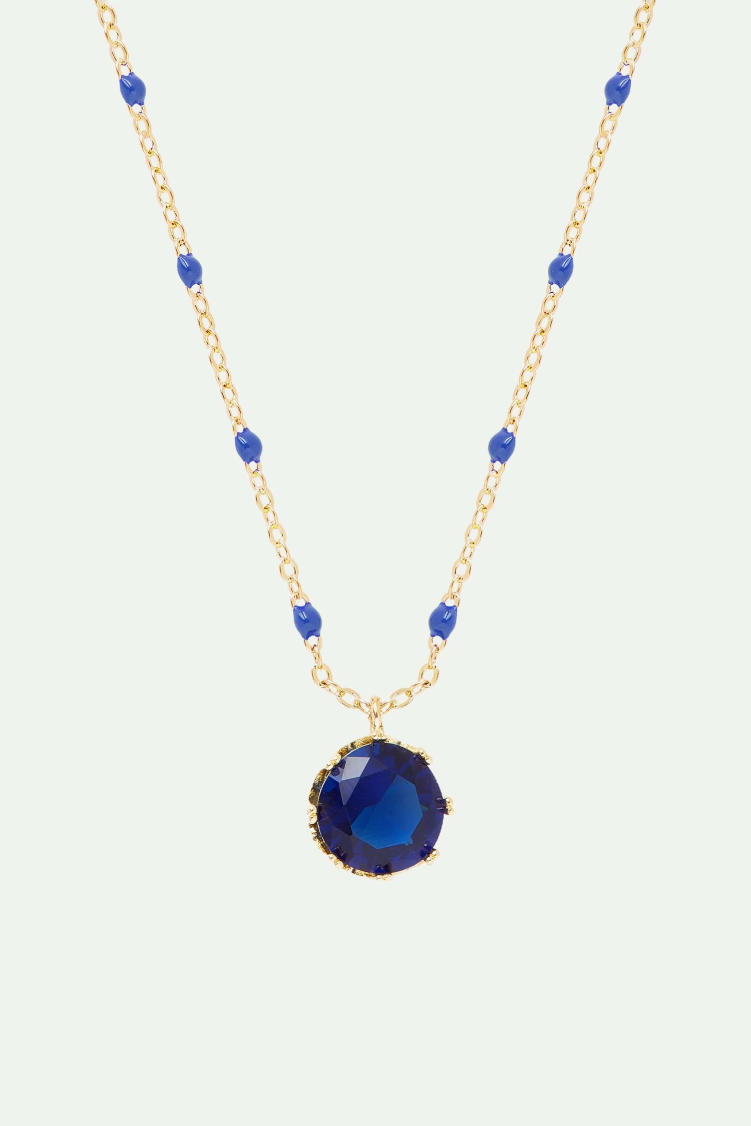 Ce collier pendentif de la collection Colorama se compose d’une pierre ronde facettée couleur bleu nuit sublimée par une chaîne dorée agrémentée de points d’émail bleus. Complétez votre style en associant ce bijou de créateur au bracelet fin pierre ronde bleue ou encore à la bague ajustable toi et moi pierres bleu et beige. Collier Pendentif : Laiton doré à l’or fin, verre facetté et fine chaîne dorée