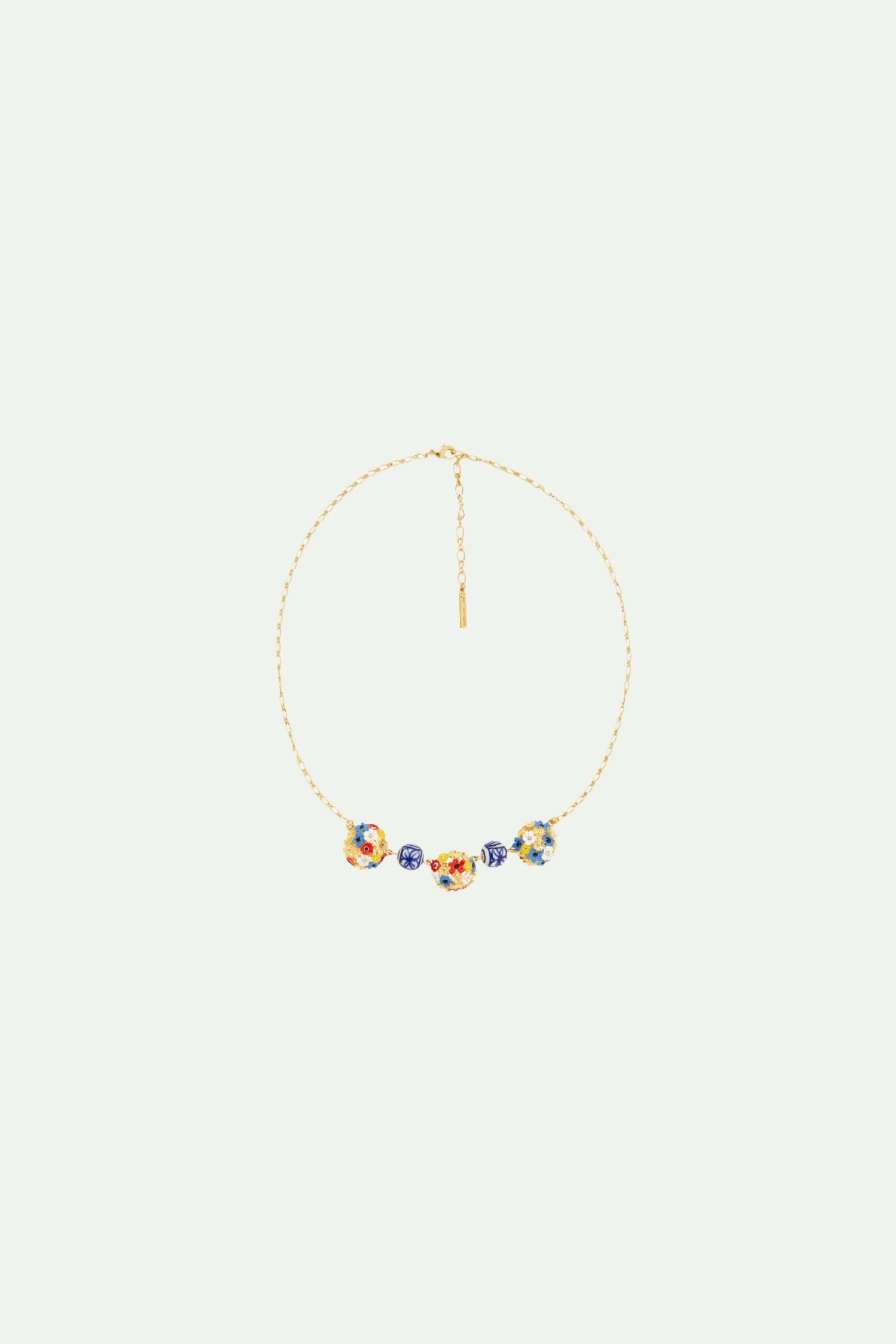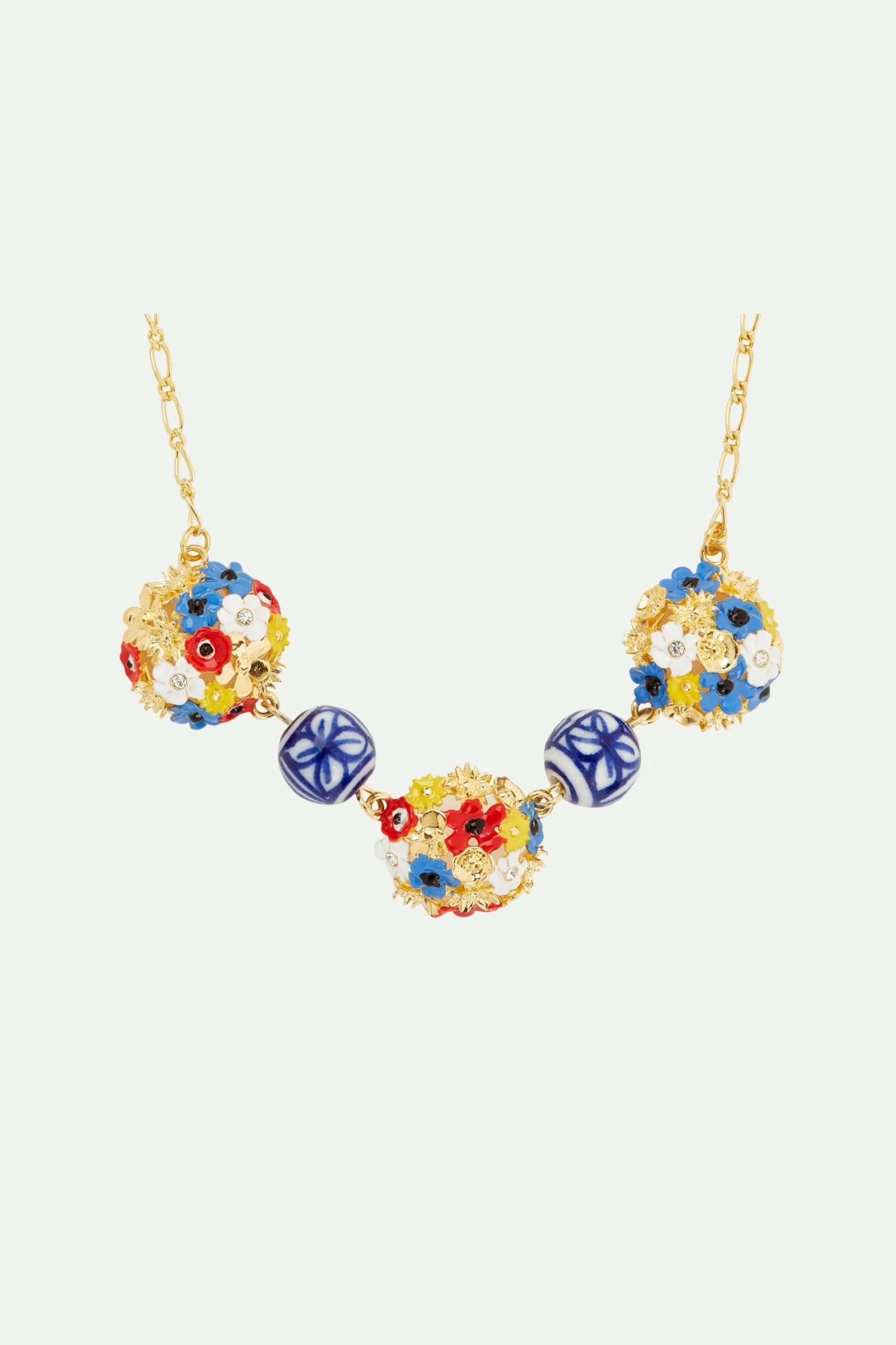Ce collier plastron est une explosion florale entrelaçant avec élégance trois bouquets éblouissants de fleurs, offrant ainsi une profusion de couleurs et de splendeur tout autour du cou. Trois bouquets fleuris composés de fleurs dorées, bleues, blanches et rouges apportent de la couleur et de la douceur au collier. Ces bouquets sont séparés par des perles en céramique délicates. Chaque fleur semble rayonner évoquant la fraîcheur printanière et la beauté naturelle. Les perles en céramique, telles des notes de musique entre les bouquets, ajoutent une touche de grâce et d’harmonie à cette composition florale exquise.