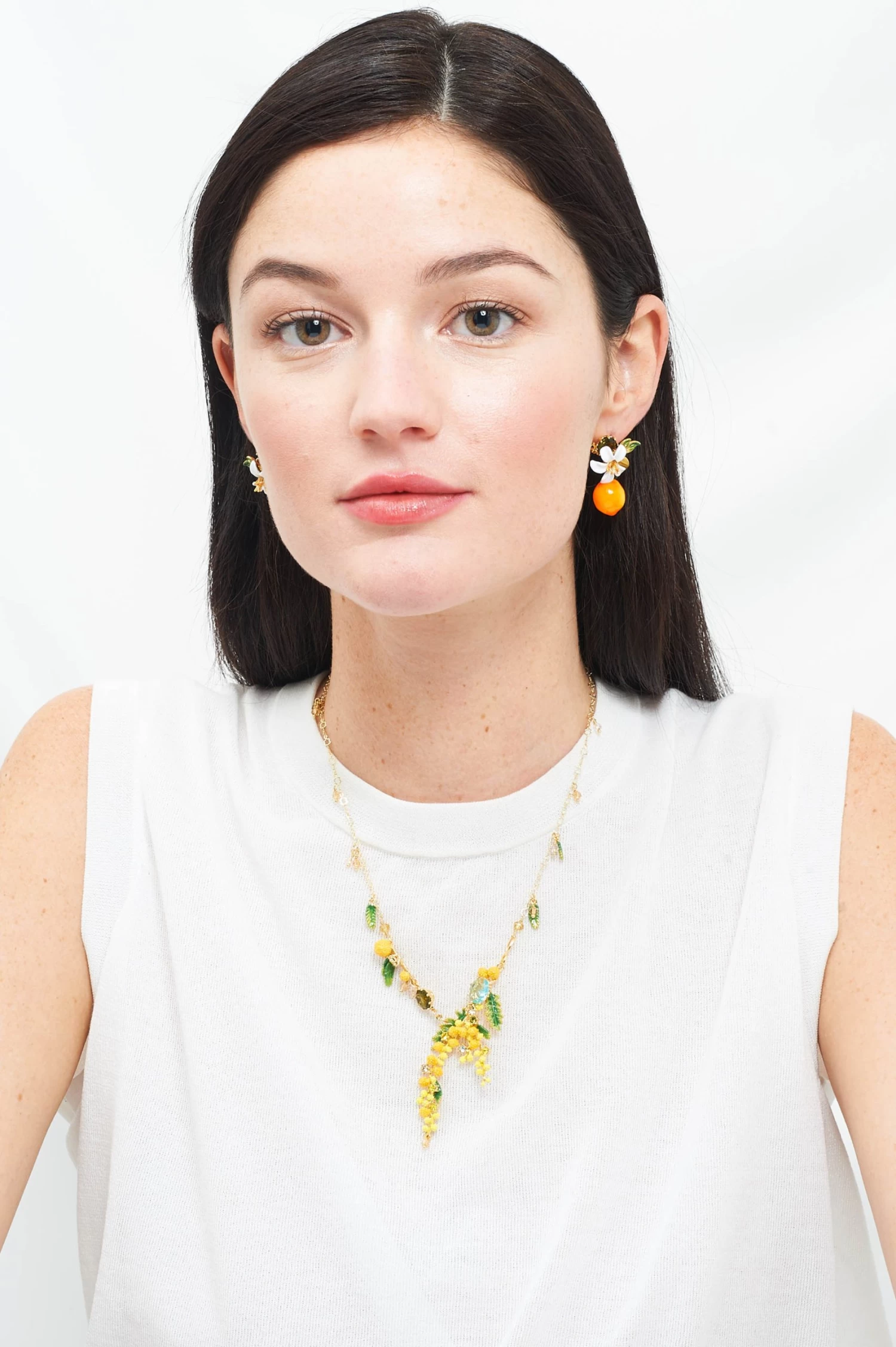 Elégance et fraîcheur pour ce collier fin grappe fruitée et cristal taillé de la Collection Jardin de Provence . Vous serez conquise par le charme et la beauté de la Provence qui se reflète sur ce bijou fantaisie. La chaîne en laiton doré à l’or fin 14 carats est composée de perles de verre translucides et de pampilles de feuilles. De fines grappes de fruits sont suspendues dans le décor pour une illusion réaliste totalement réussie. Deux verres taillés noir et bleu ciel viennent s’ajouter à l’atmosphère gracieuse de votre futur collier. Tous les éléments sont réalisés en laiton émaillé et en résine 3D pour votre plus grand plaisir.