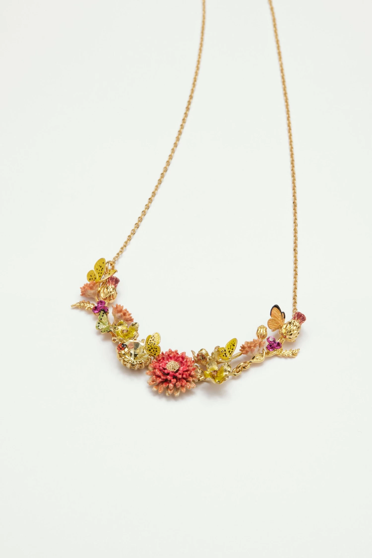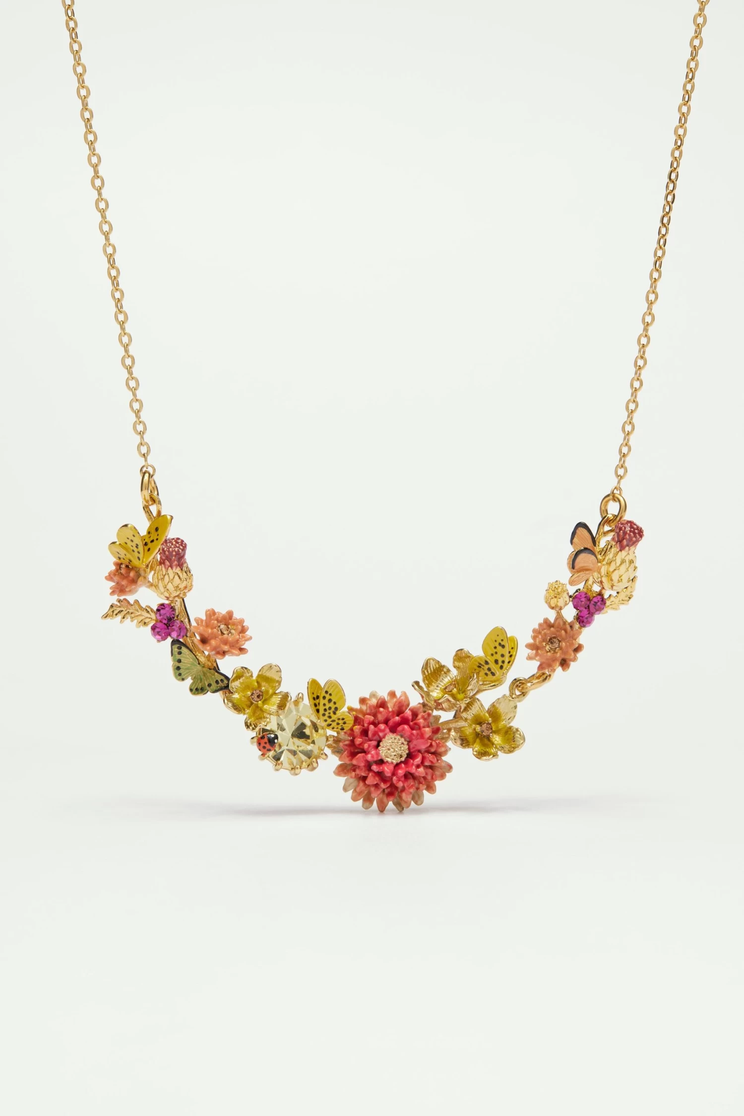 Collier plastron, papillons colorés émaillés à la main, détails de dahlia, coccinelle, fruits et fleurs des champs, pierre ronde sertie en verre taillé pastel, chaine en laiton doré à l’or fin.