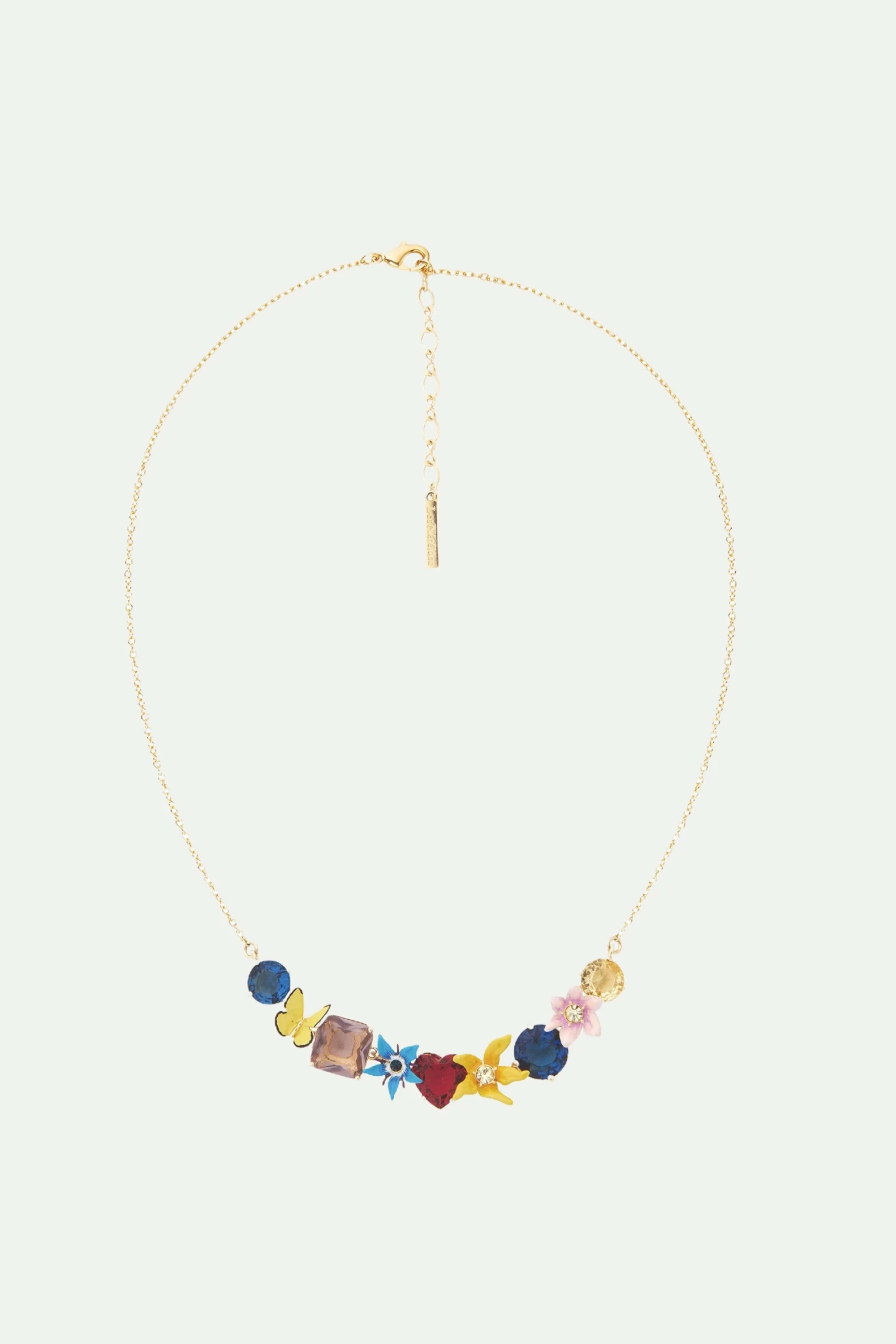Papillon jaune, fleur de tomate, fleur d’aubergine, fleur de bourrache et verres facettés de la Diamantine s’unissent pour former un paysage bucolique à votre cou. Les teintes profondes de bleu, de jaune et de rouge se mêlent avec harmonie, créant ainsi une palette visuelle captivante. Le papillon jaune, symbole de légèreté et de transformation, ajoute une touche de grâce à l’ensemble. Les fleurs de tomate, d’aubergine et de bourrache, fidèlement représentées, apportent une note florale délicate et un charme naturel à ce collier. Ce bijou de créateur est un hommage à la beauté de la nature sublimée par l’art de la joaillerie. Collier Plastron : Laiton doré à l’or fin émaillé à la main, verres et cristaux facettés.