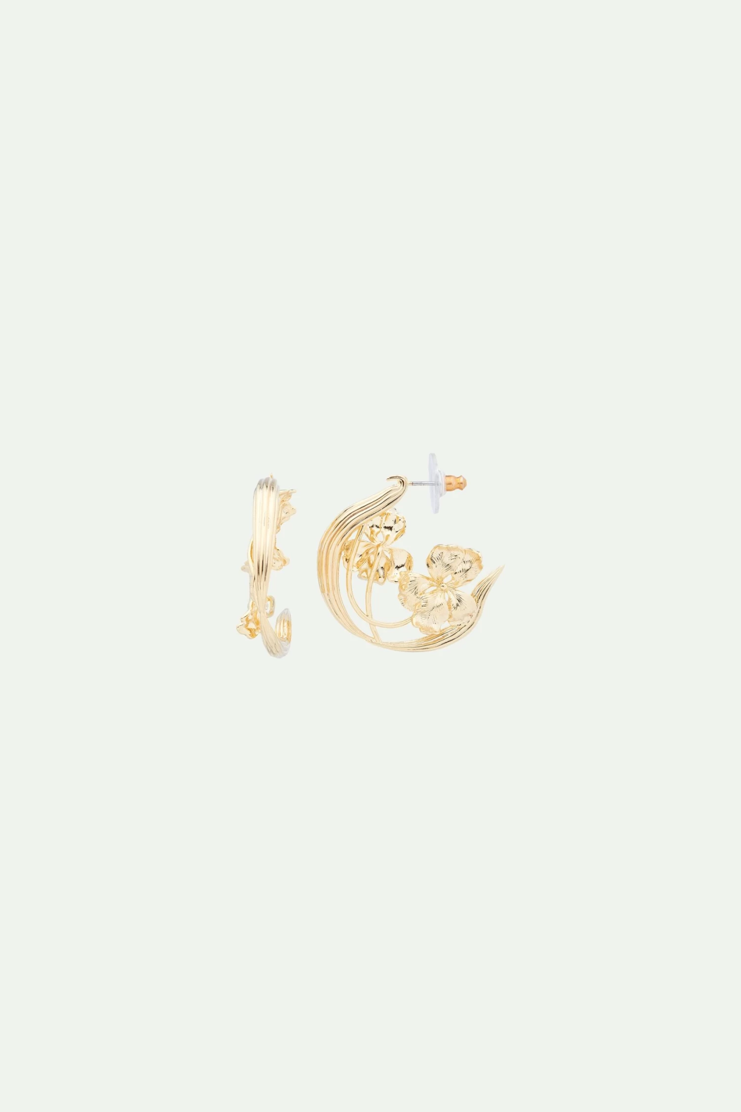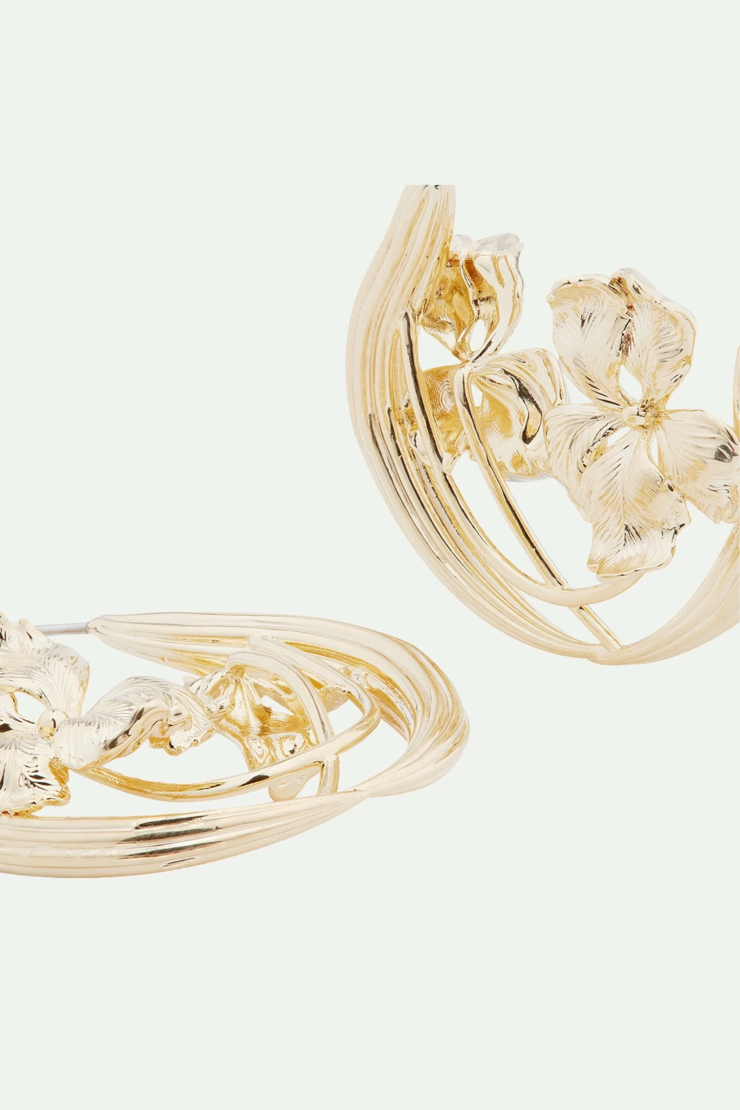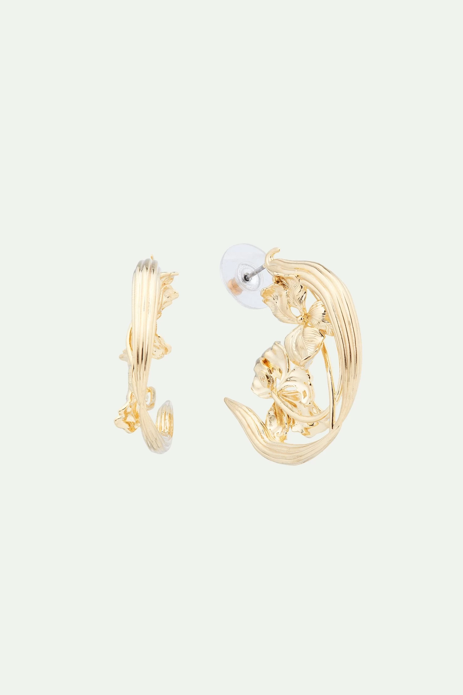 Ces créoles entièrement dorées à l’or fin de la collection Nature Flamboyante sont joliment décorées de fleurs d’iris. A travers l’ondulation des se dessine une harpe végétale. Les courbes délicates de ces boucles d’oreilles bohèmes font de cette paire une pièce originale et raffinée qui peut se porter à l’occasion d’une soirée habillée. Boucles d’Oreilles : Laiton doré à l’or fin.